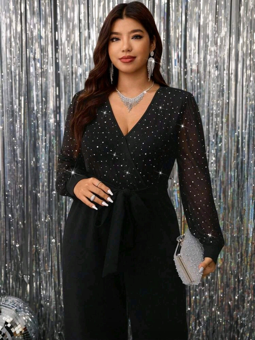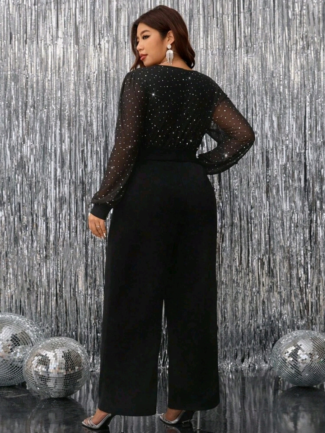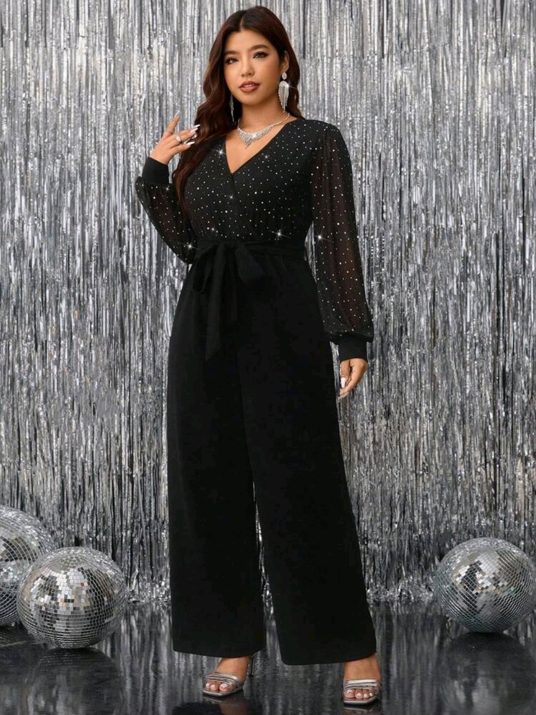 جمبسوت أنيق بمقاسات كبيرة، أسود لامع مرصع بأحجار الراين، بياقة على شكل حرف V وأكمام طويلة وأرجل واسعة، مصنوع من قماش محبوك عالي المرونة