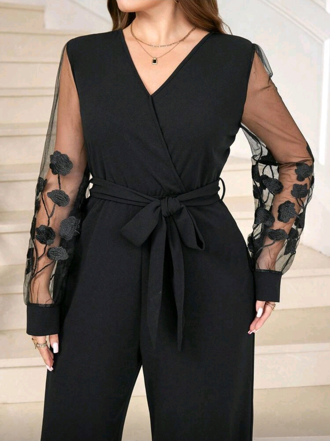 جمبسوت أسود أنيق بمقاسات كبيرة ، مطرز بالزهور، بتصميم شبكي مرقع،بأكمام طويلة