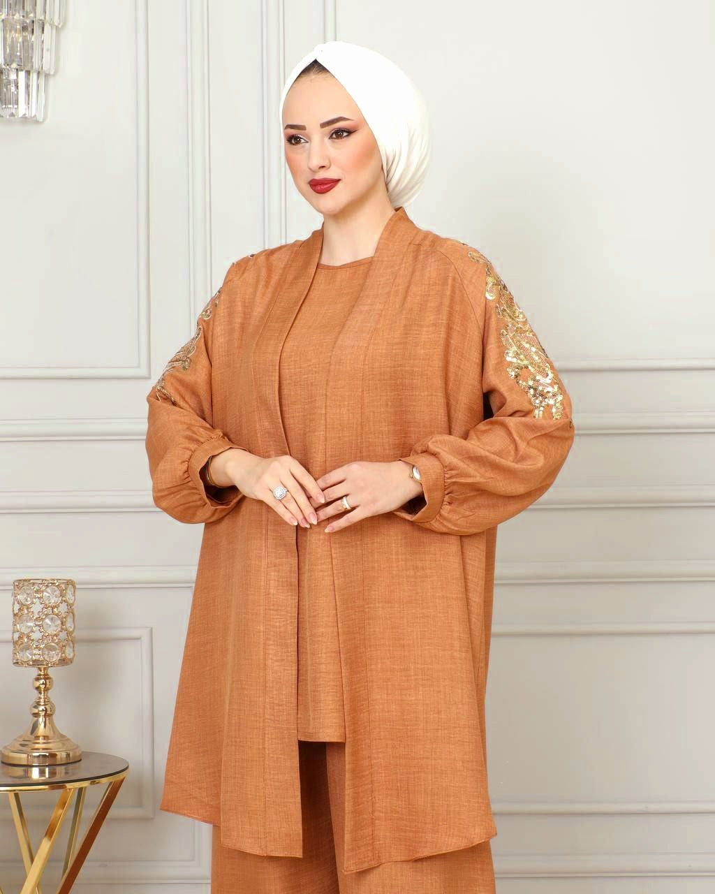 طقم 3 قطع بلون ياجوري 2 مزين بالترتر الذهبي للمقاسات الكبيرة