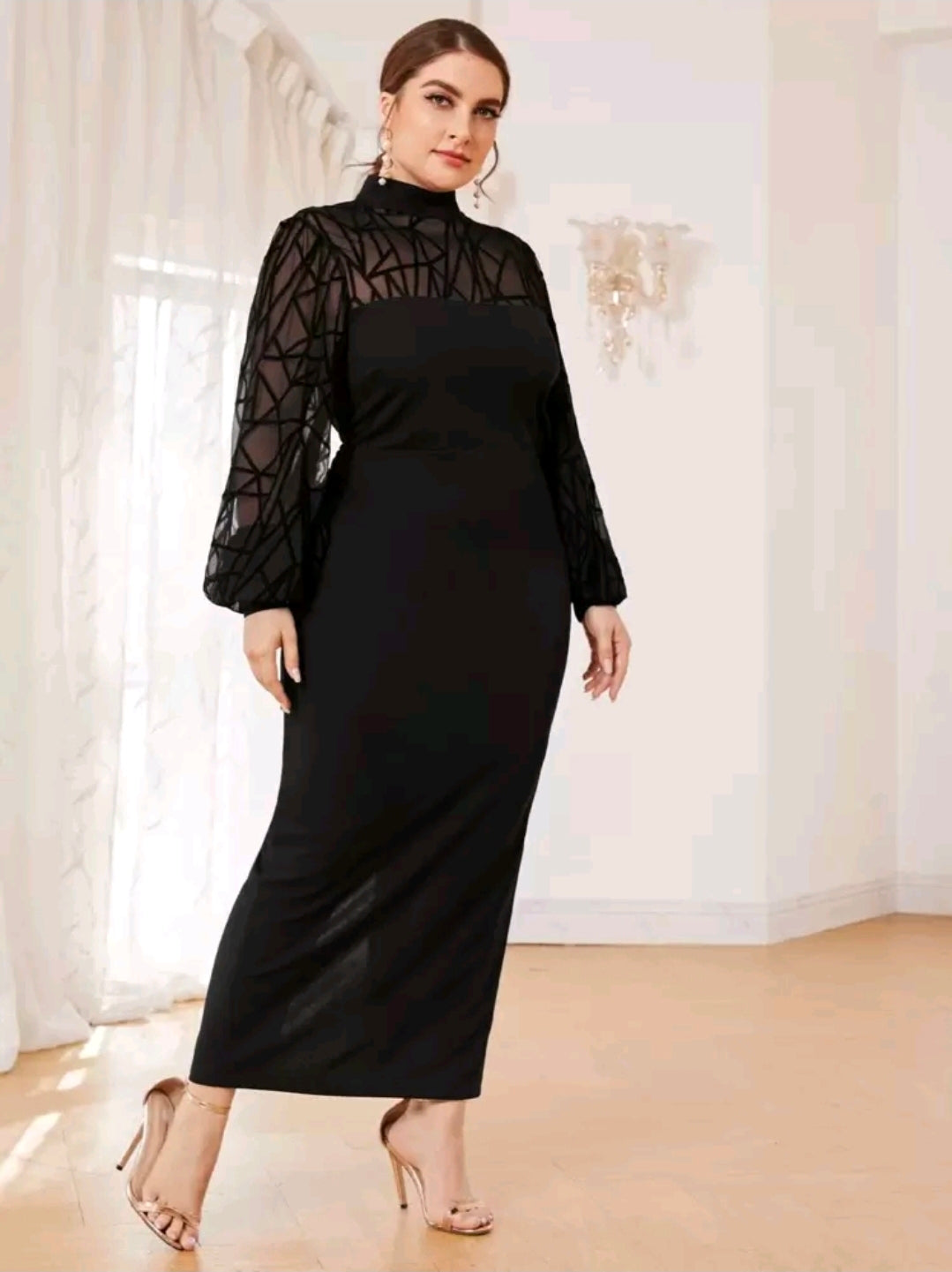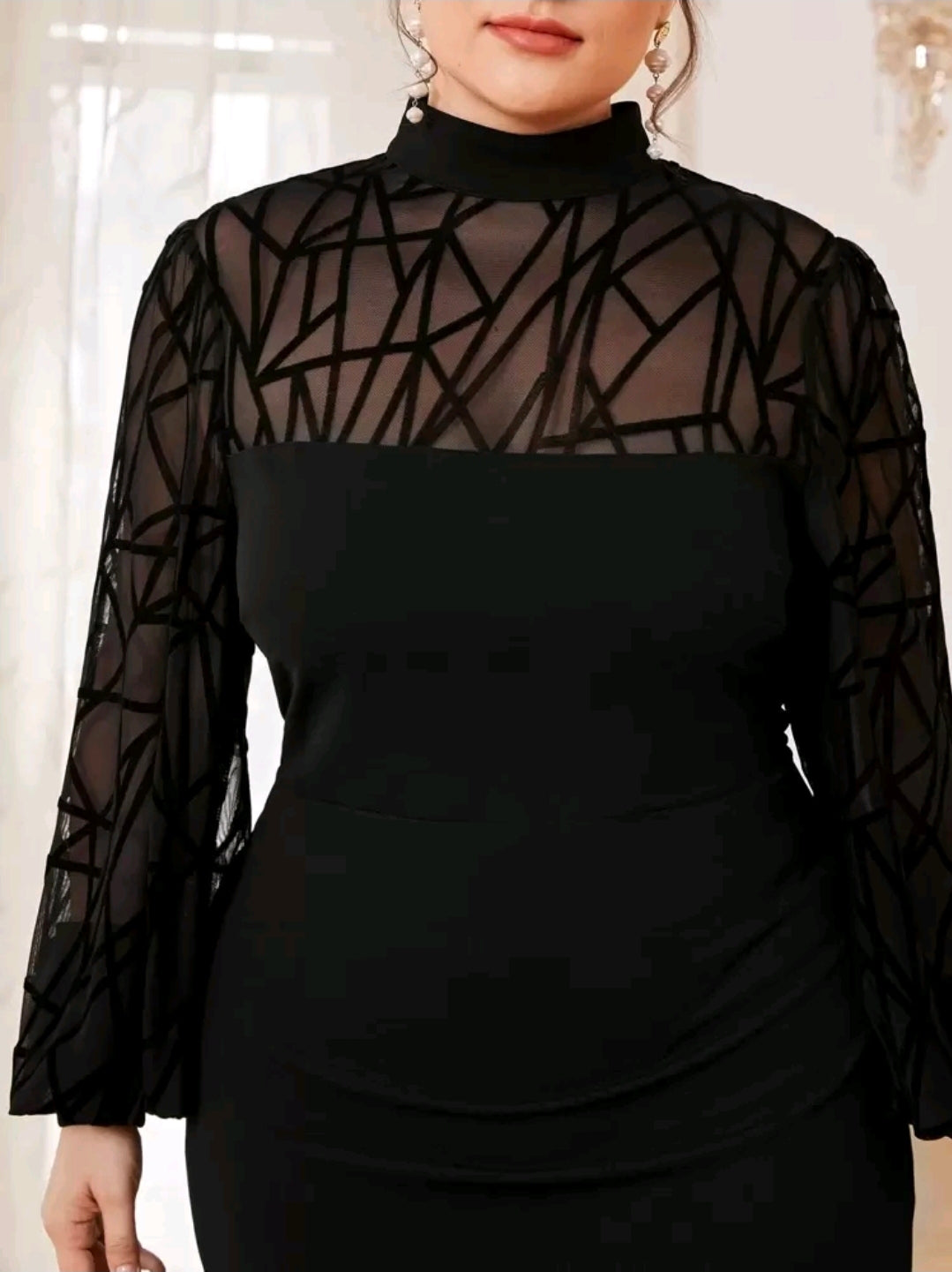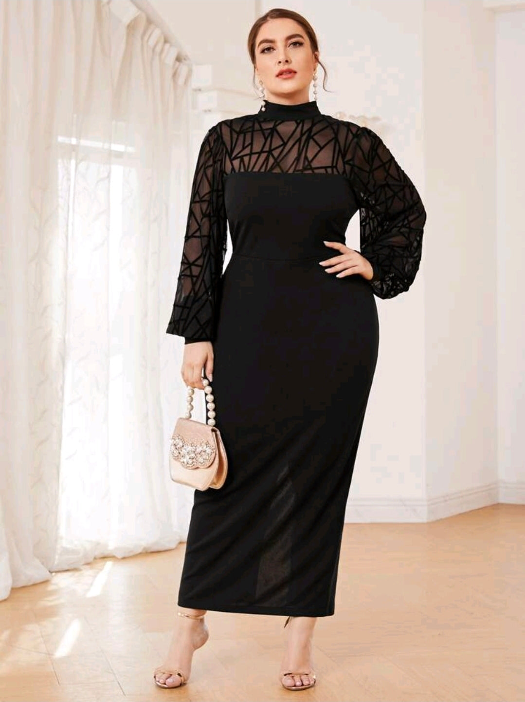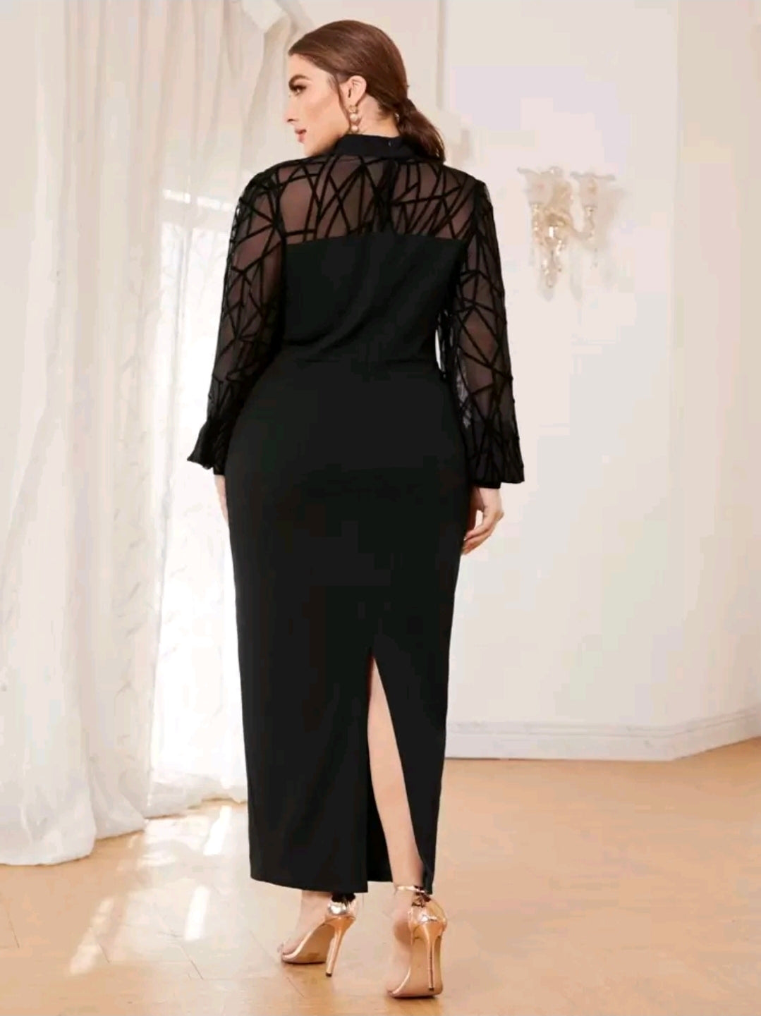 فساتين أسود شيك بمقاسات كبيرة، بفتحة أنيقة واشكال هندسية فالصدر و اليدين