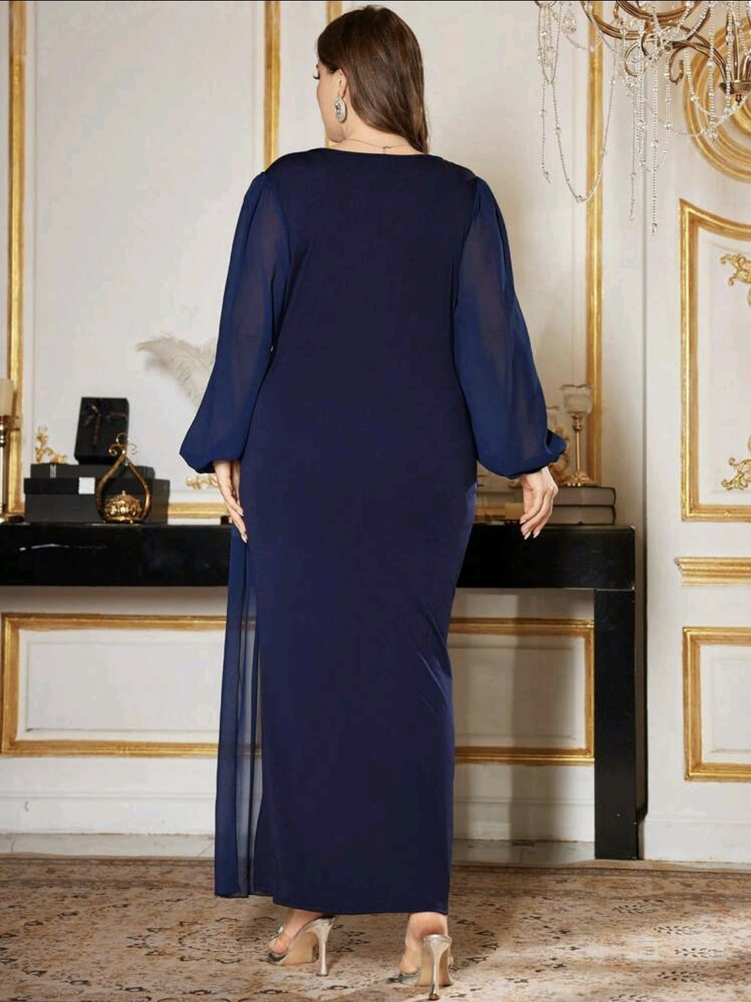 فستان أزرق ذو الرقبة على شكل حرف V والمزين بأحجار الراين بأكمام طويلة ومقاس كبير