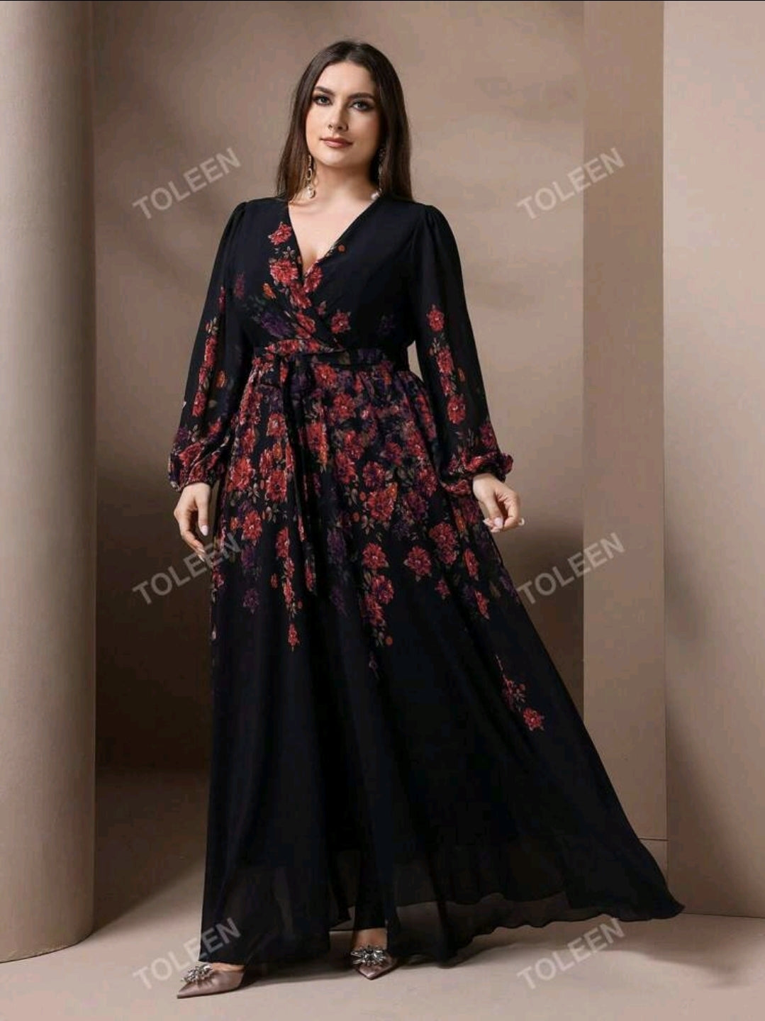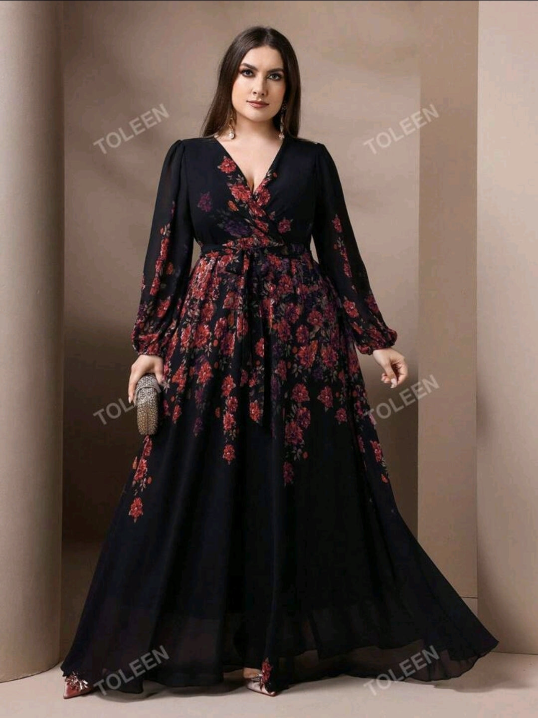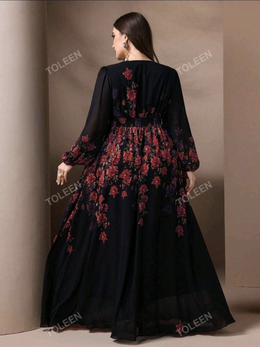 فستان أسود مزين بالورود الحمراء أنيق رقبة مفتوحة و أكمام طويلة بماقاسات كبيرة