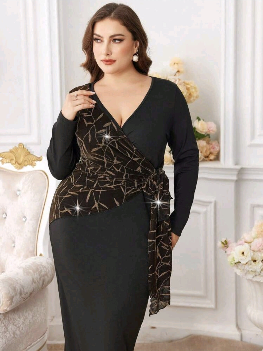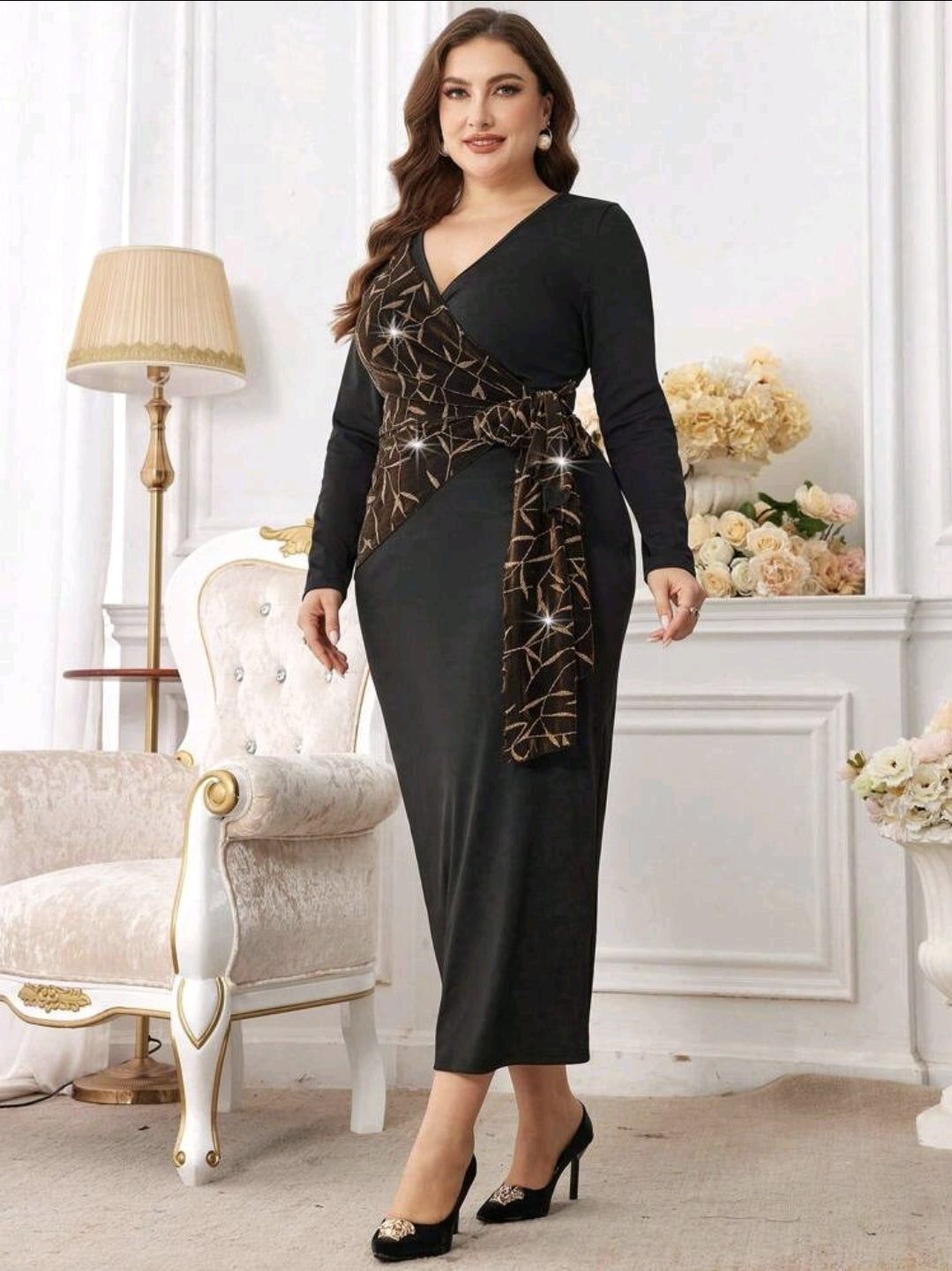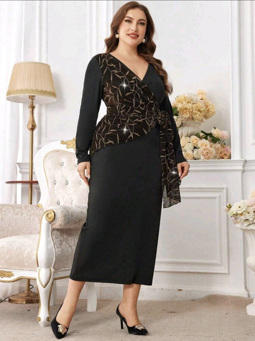 فستان أسود مع رباط جانبي من القماش المرقّع بالذهبي مع رقبة متقاطعة أنيقة، مقاس كبير.