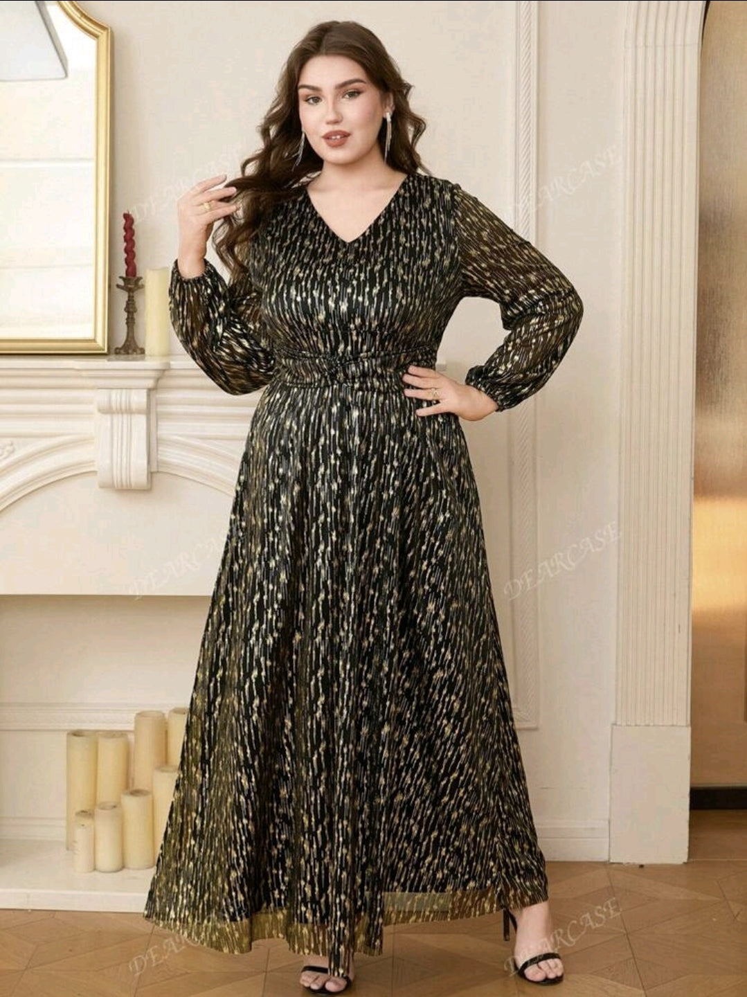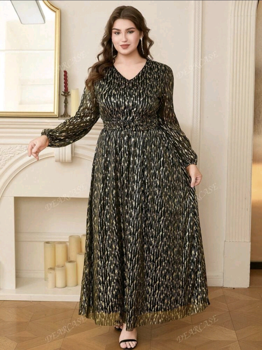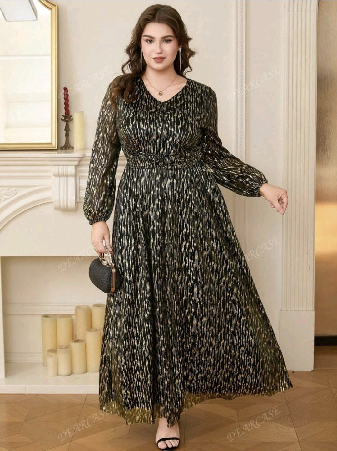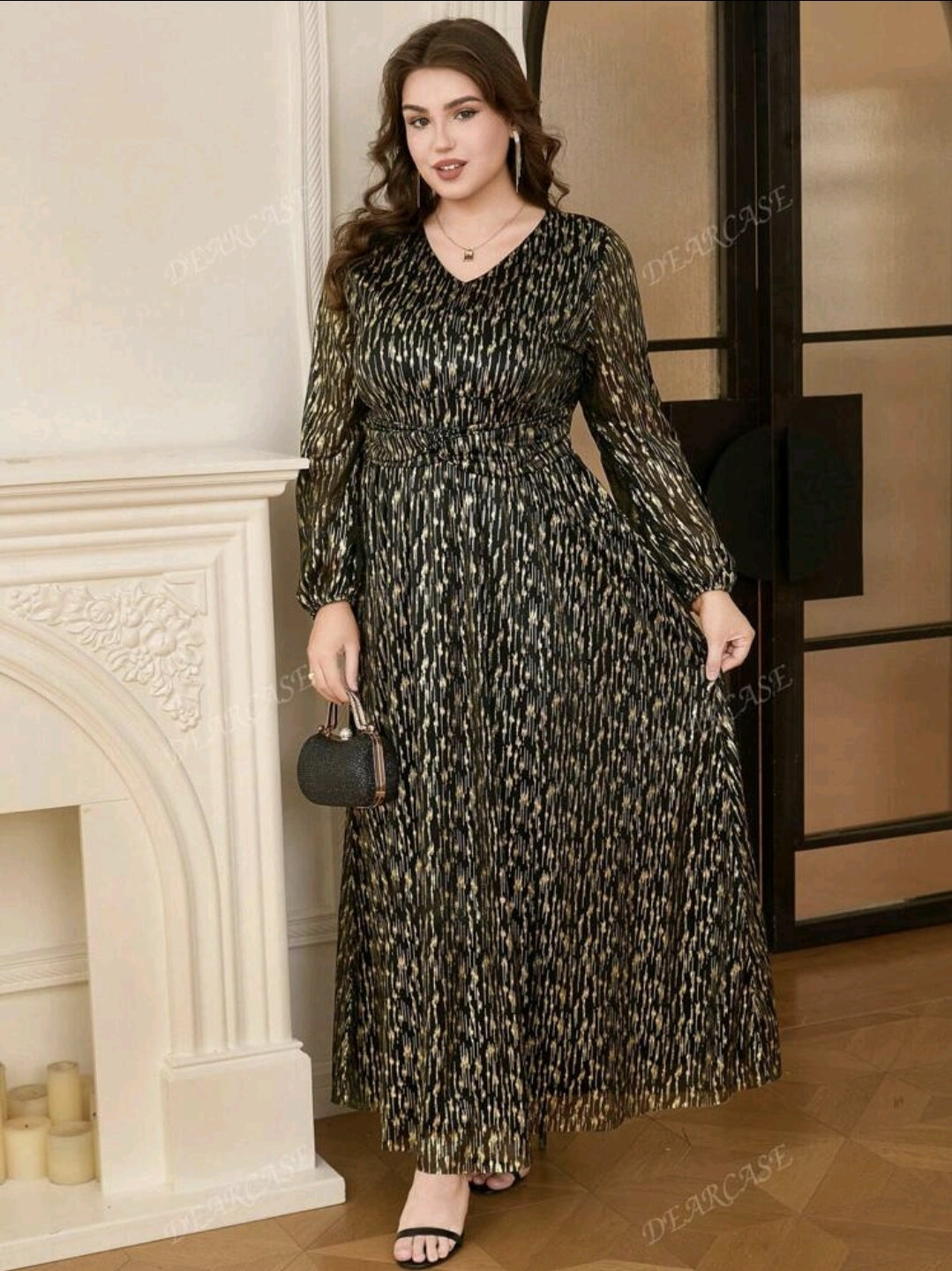 فستان أسود و ذهبي أنيق بأكمام طويلة ومزخرف بترتر أنيق مقاس كبير