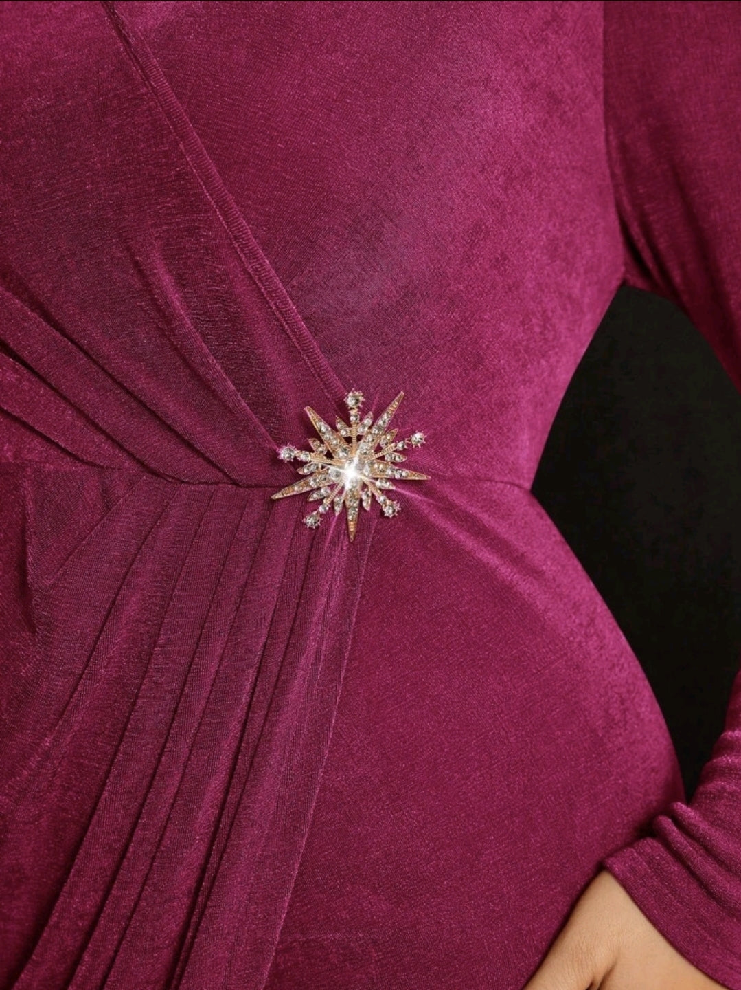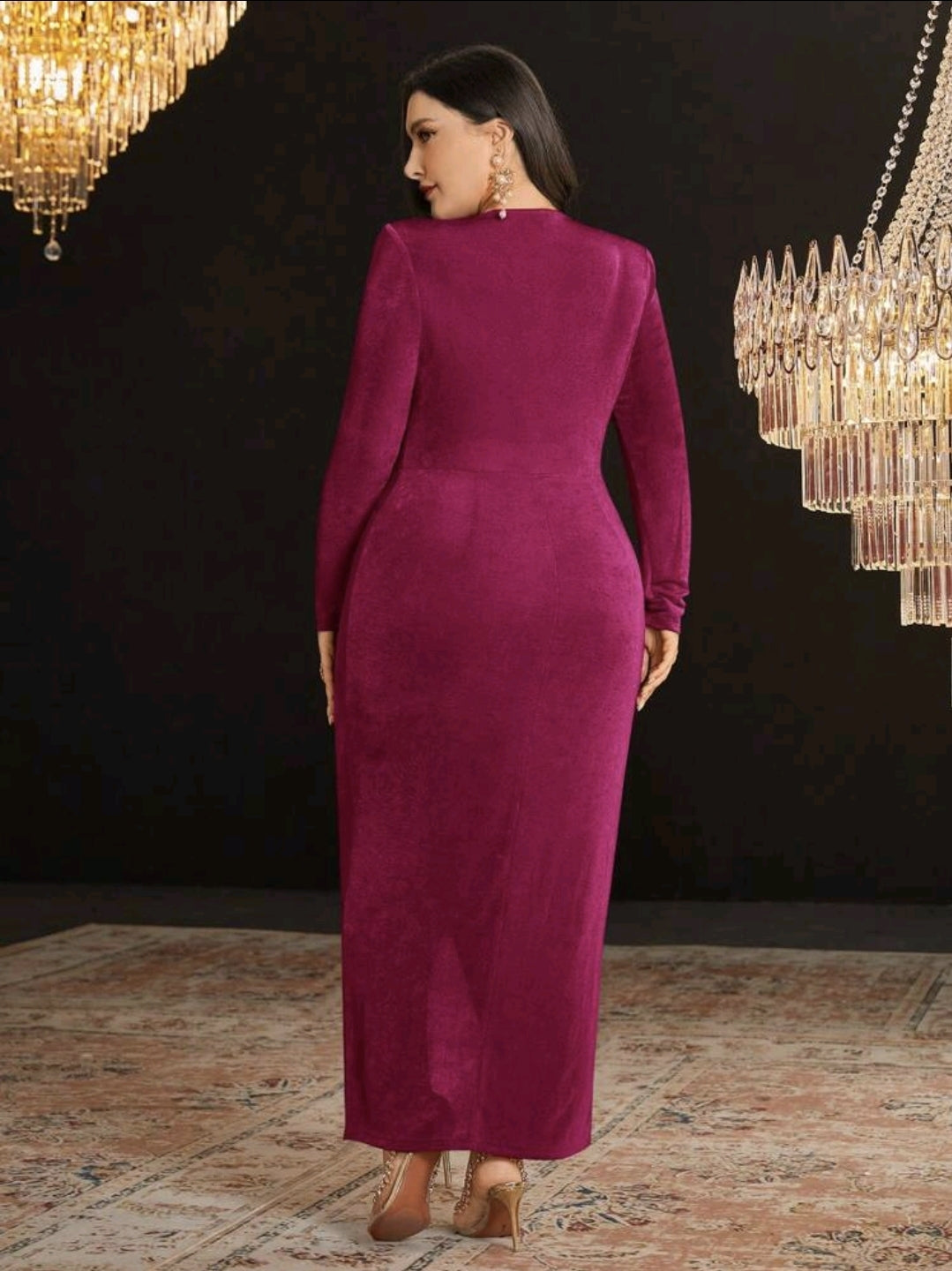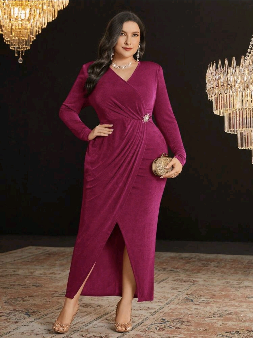 فستان أنيق بأكمام طويلة وفتحة رقبة على شكل حرف V ، فستان حفلات أنيق للمقاسات الكبيرة