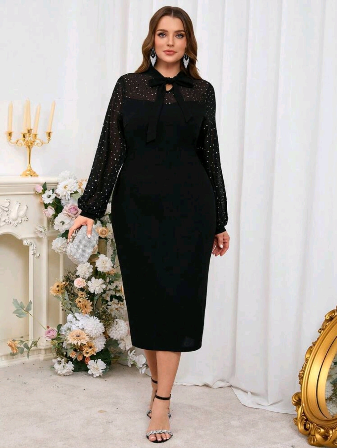 فستان اسود انيق بأكمام طويلة شفافة و ربطة عنق أمامية مناسب للمقاسات الكبيرة