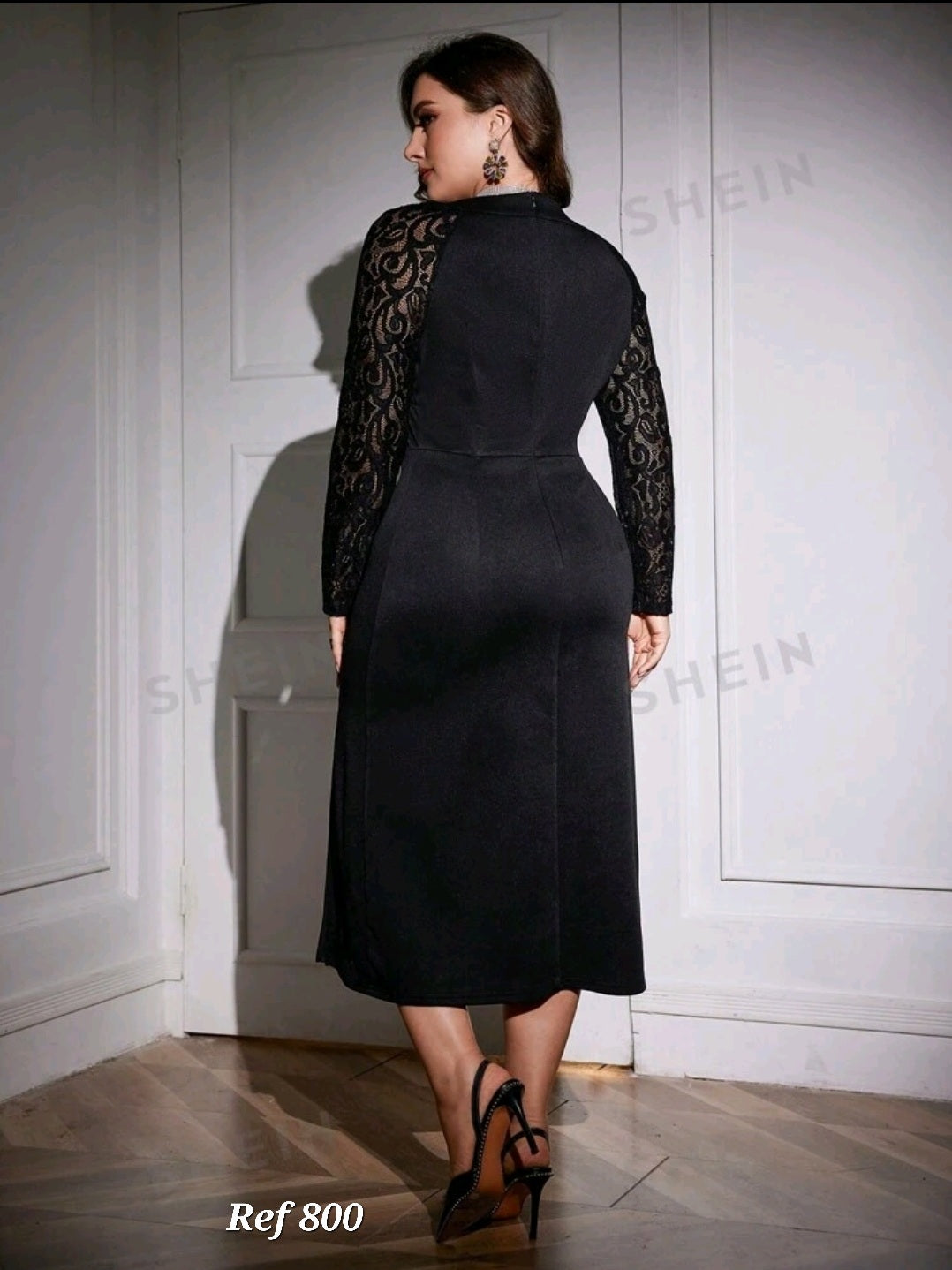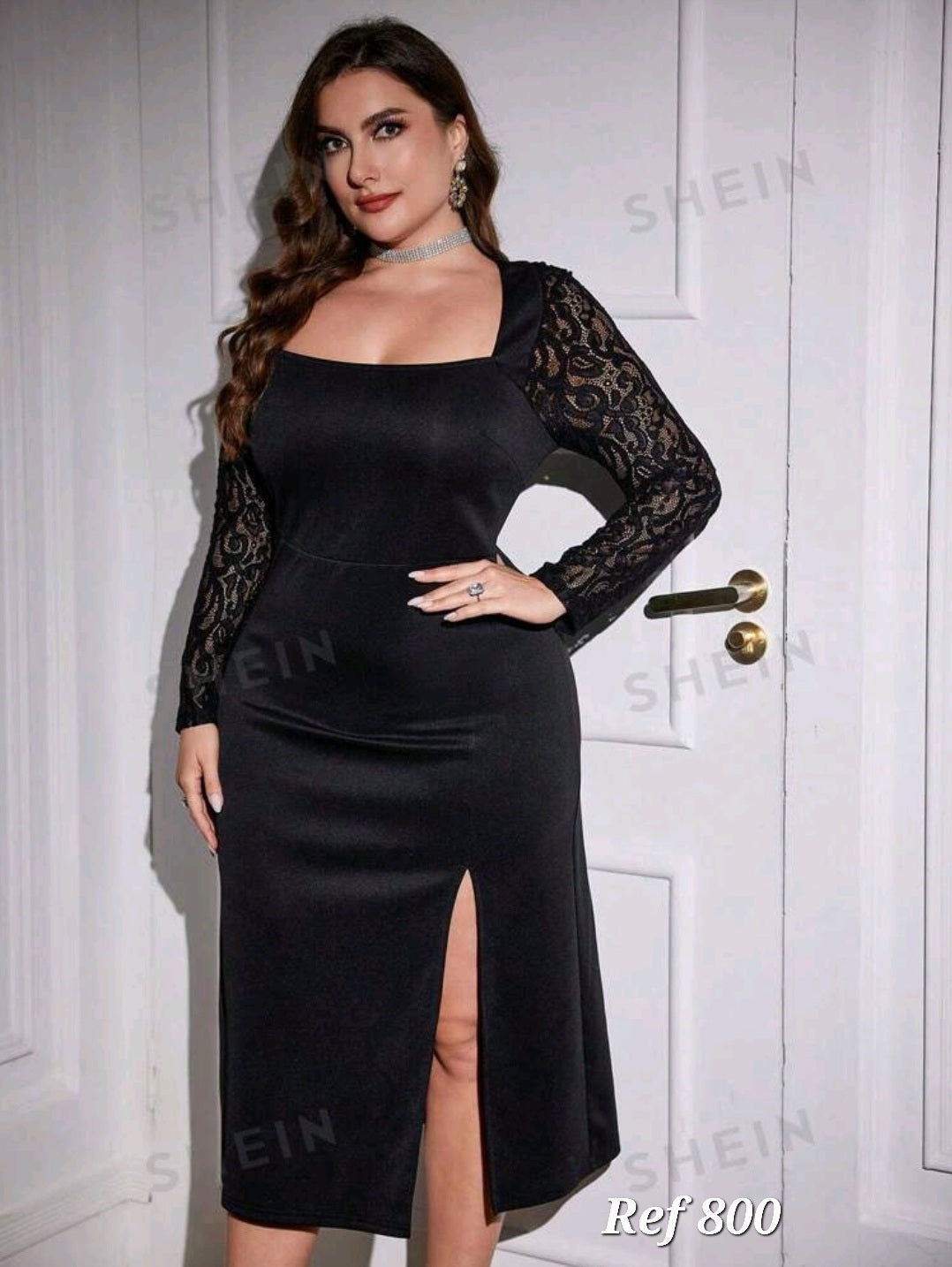 فستان المناسبات اسود بسيط و انيق جدا متوسط الطول مع فتحة من الجنب و اكمام طويلة من الدنتيل ,مقاس كبير