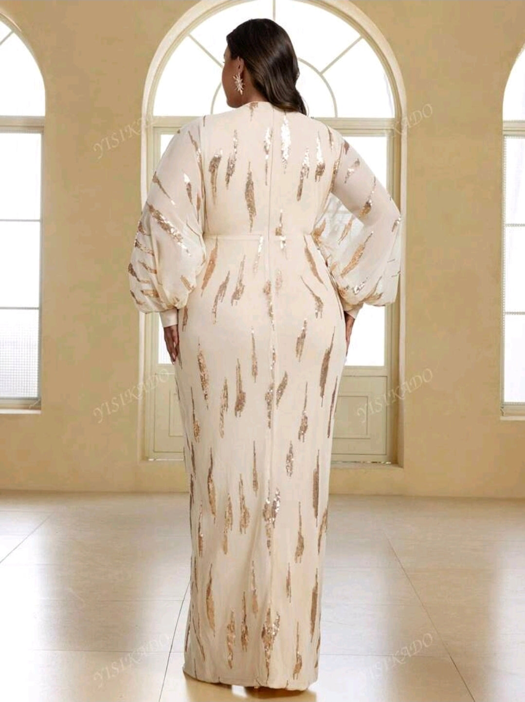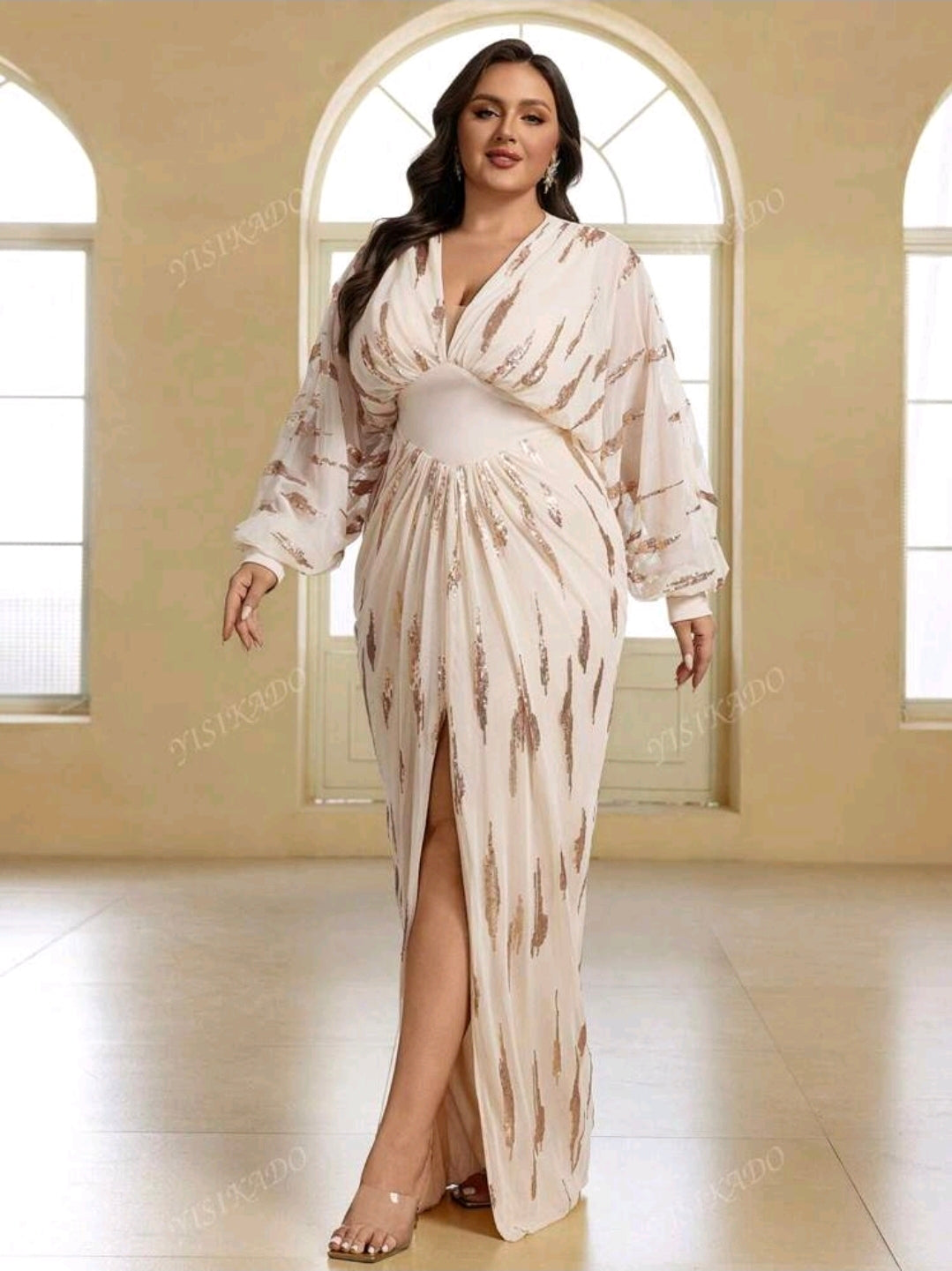 فستان باج بأكمام طويلة مع ترتر منقسم، فستان بمقاسات كبيرة