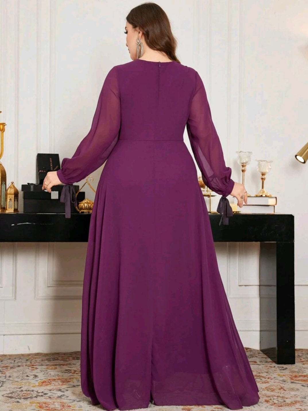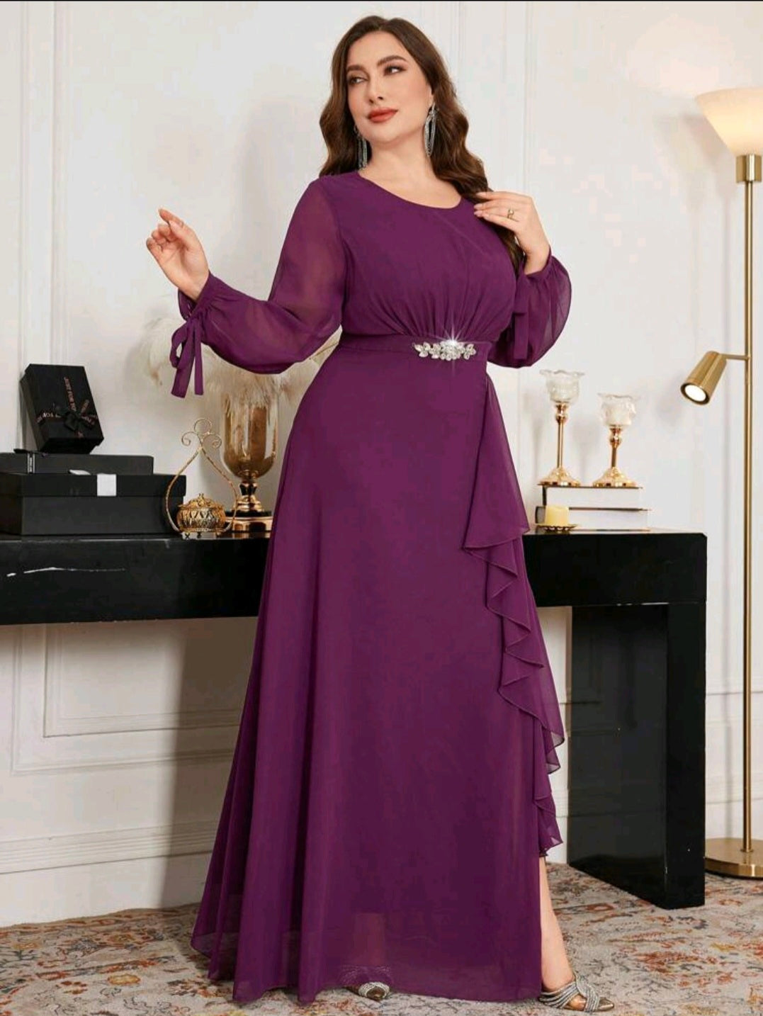 فستان باللون البنفسجي أنيق أكمام طويلة شفافة و ربطة فالمعصم مع بروش فالخصر