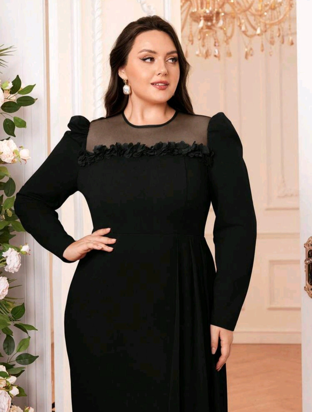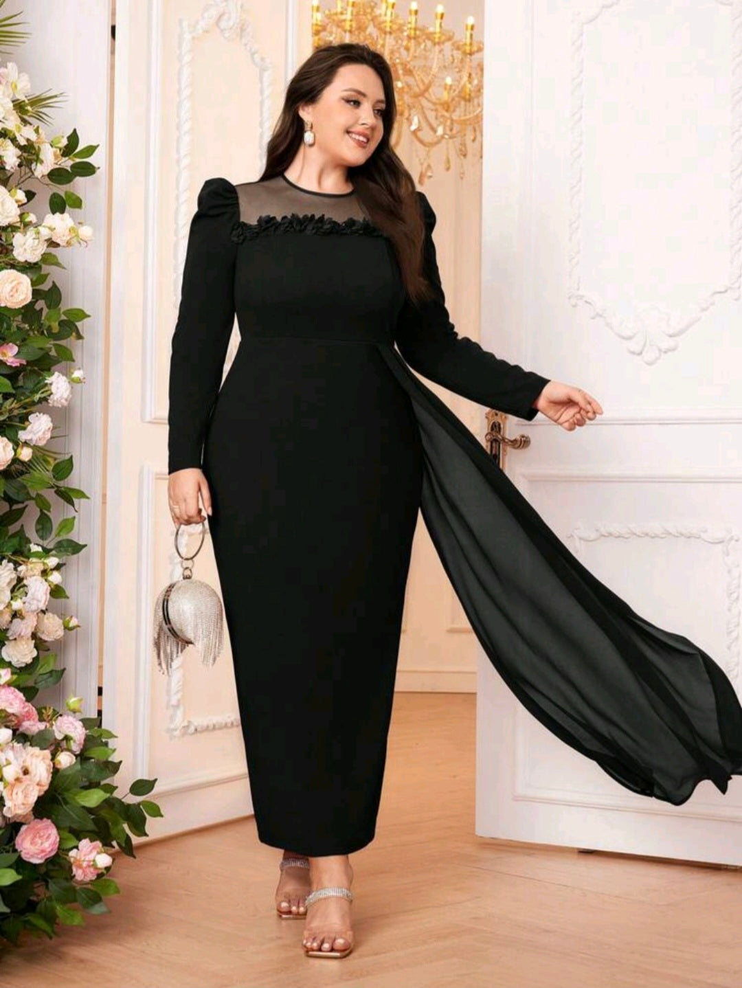 فستان سهرة أنيق بأكمام طويلة منفوخة فالكتف ورقبة دائرية مزين بالورود فالصدر مع فولار فالجنب مقاسات كبيرة