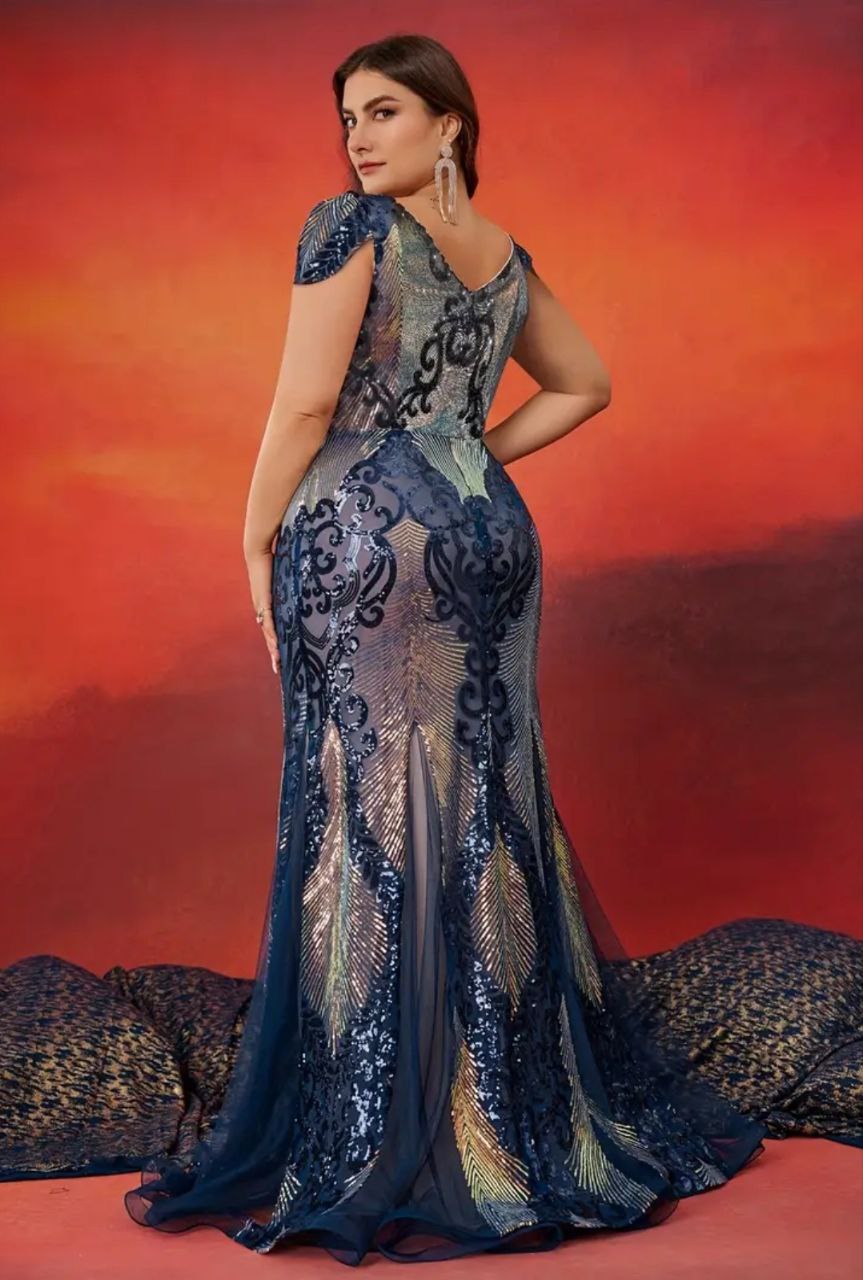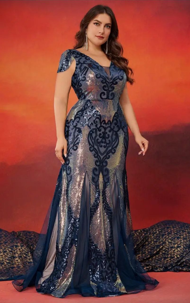 فستان فاخر و أنيق مزين بالترتر رقبة مفتوحة V و أكمام قصيرة