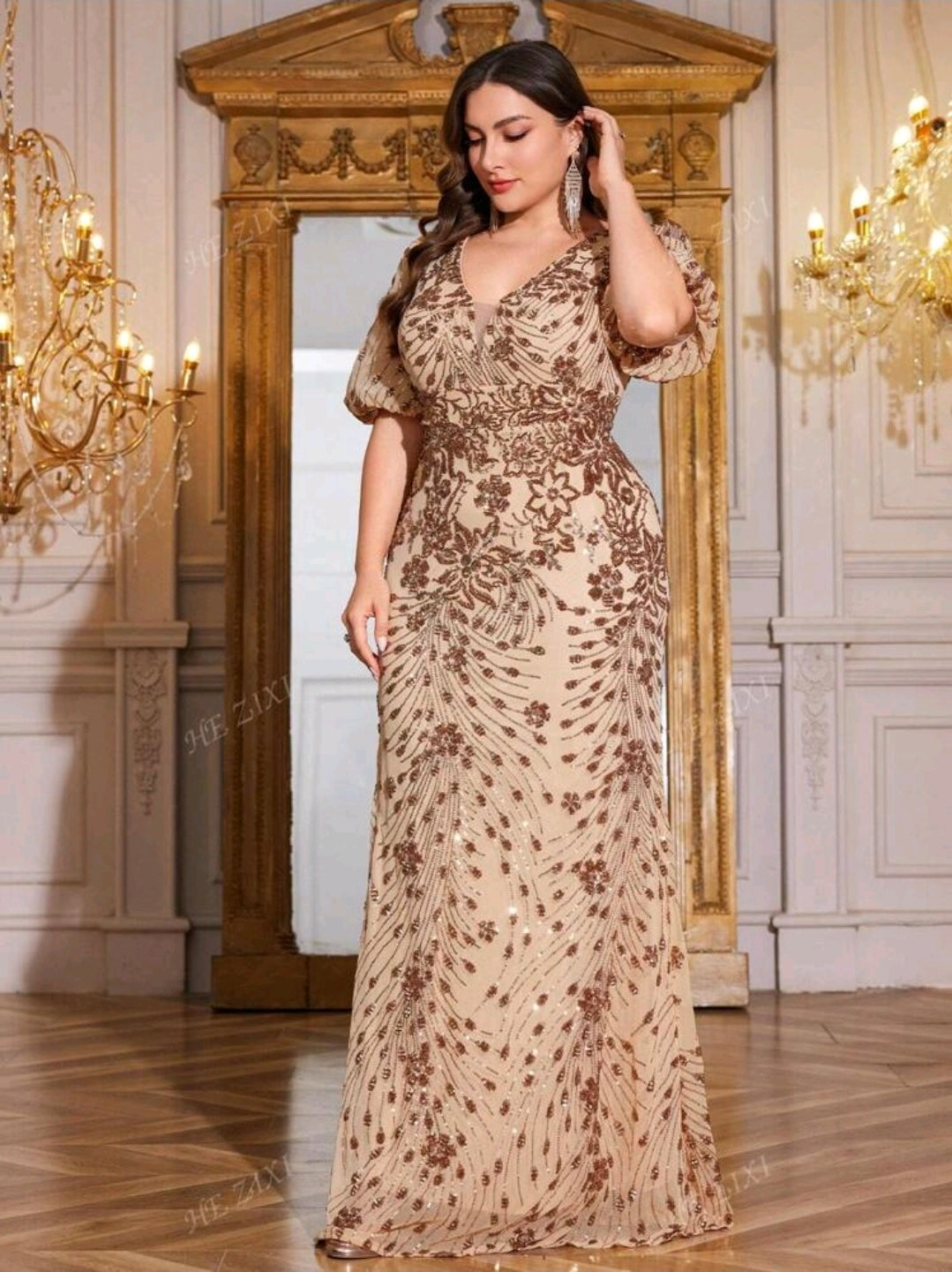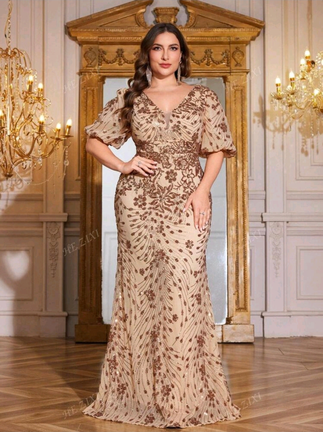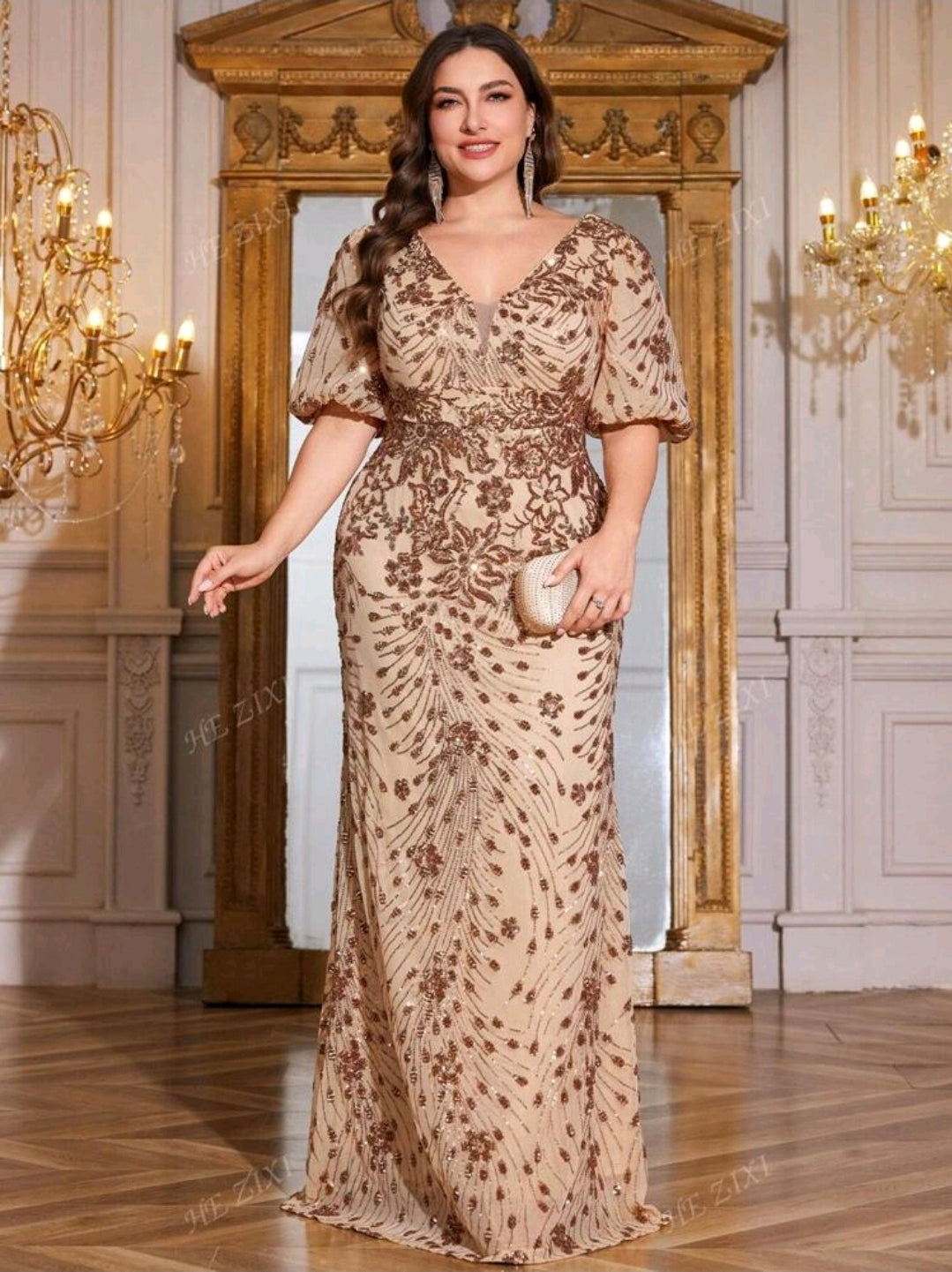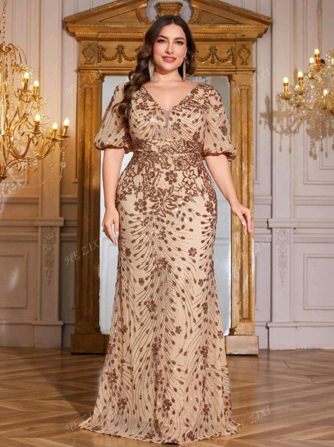 فستان سهرة أنيق ، بأكمام واسعة ، وفتحة رقبة على شكل حرف V، للنساء ذوات المقاسات الكبيرة. فستان عالي الجودة، مرن ومزين بالترتر، مثالي للحفلات وحفلات الزفاف وحفلات العشاء الفاخرة (مُزين بإتقان).
