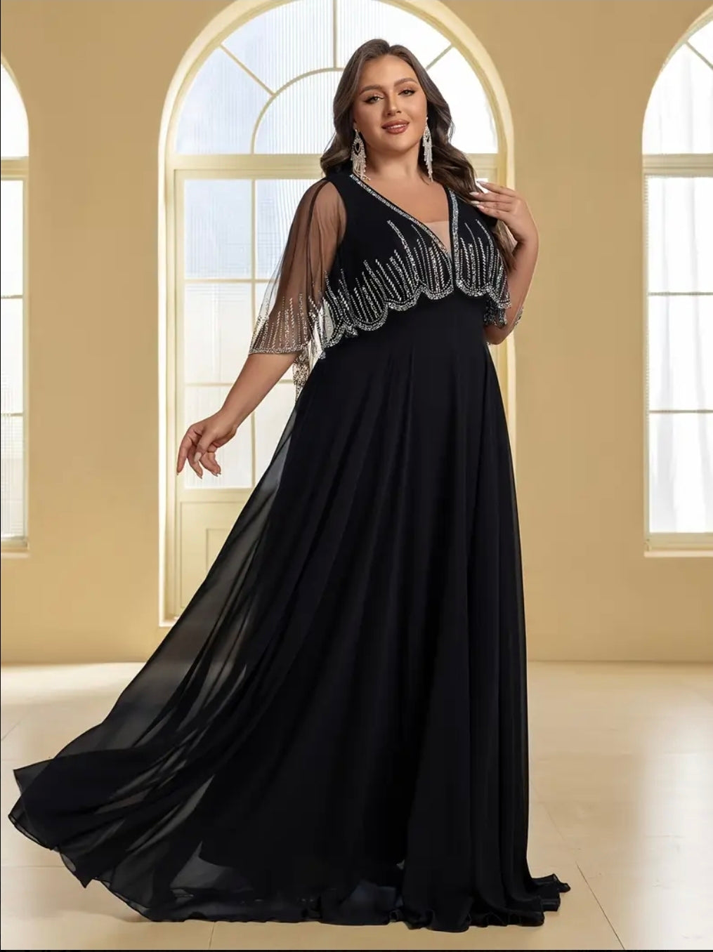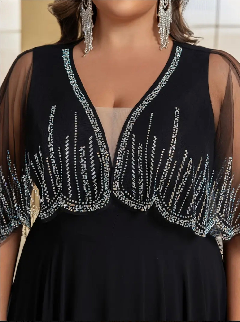فستان سهرة أنيق من التول مع أحجار الراين، رقبة على شكل حرف V وشال، مقاس كبير