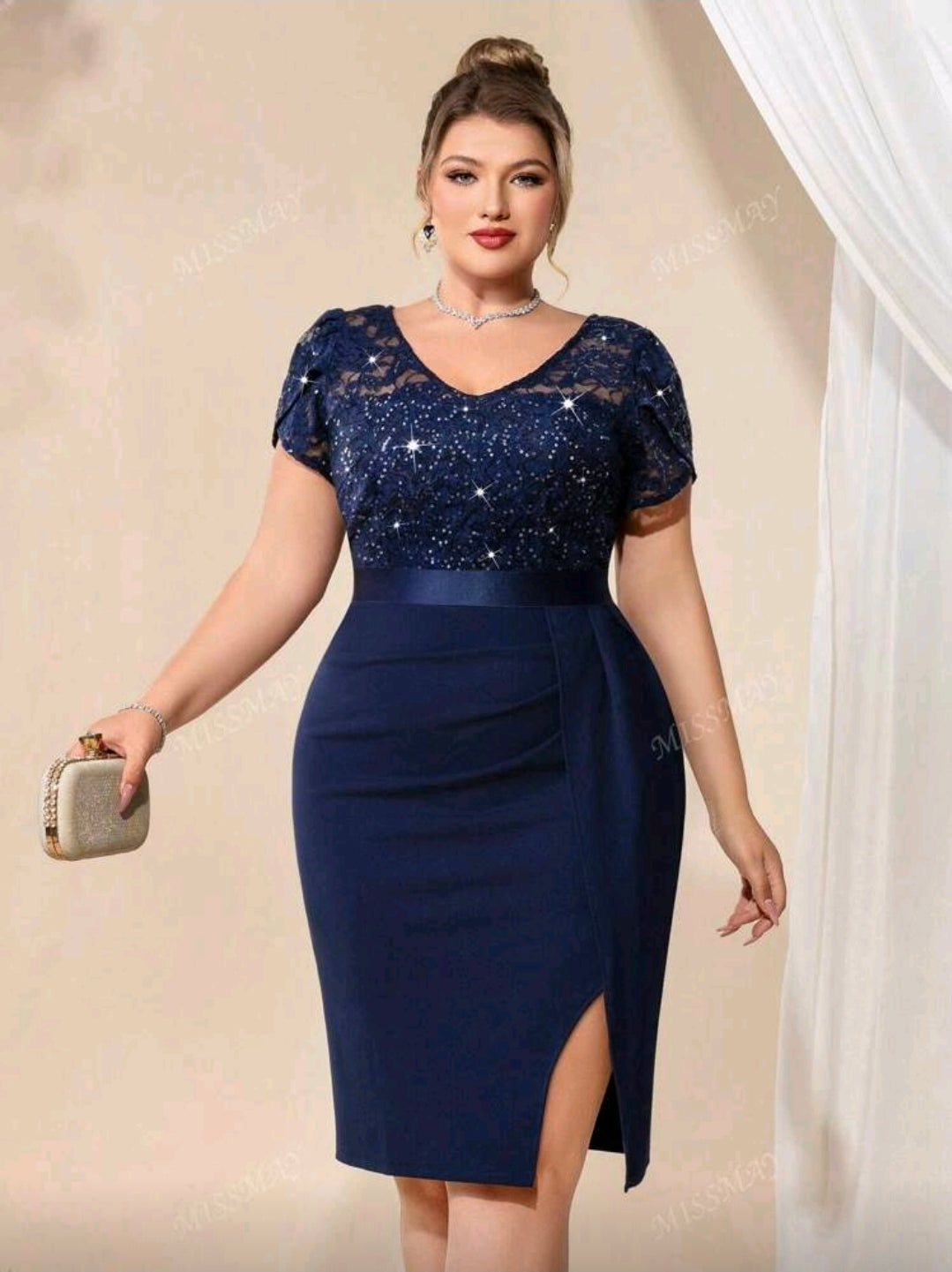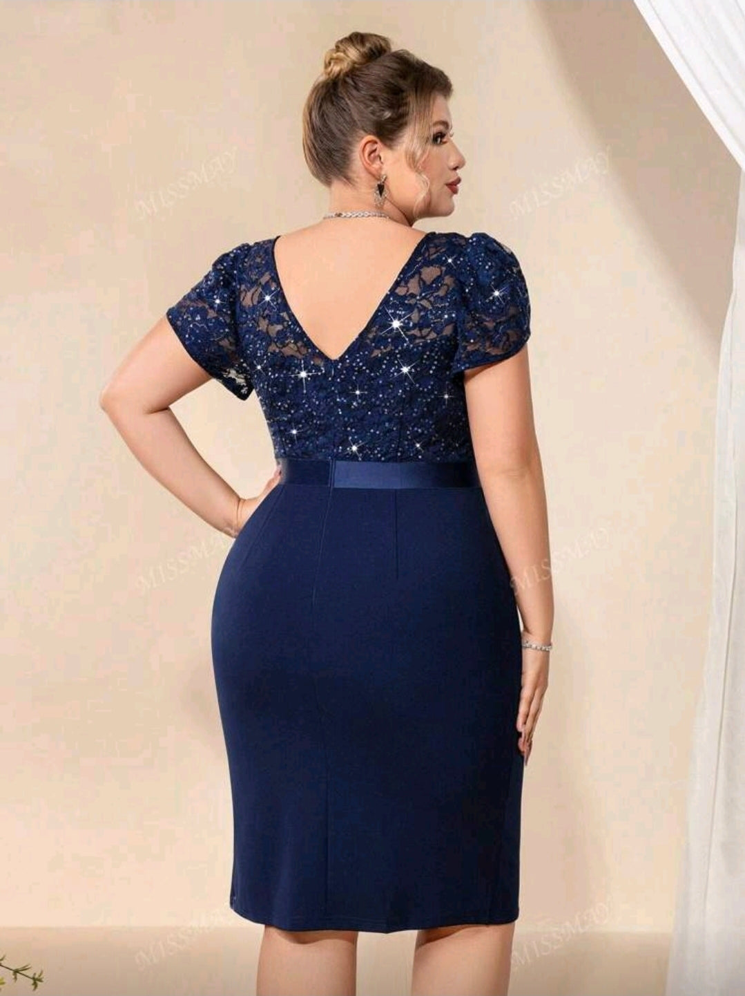 فستان أزرق ضيق مزين بالترتر والدانتيل بتصميم أزهار، بفتحة رقبة على شكل حرف V، بأكمام مكشكشة، وفتحة عند الفخذ.