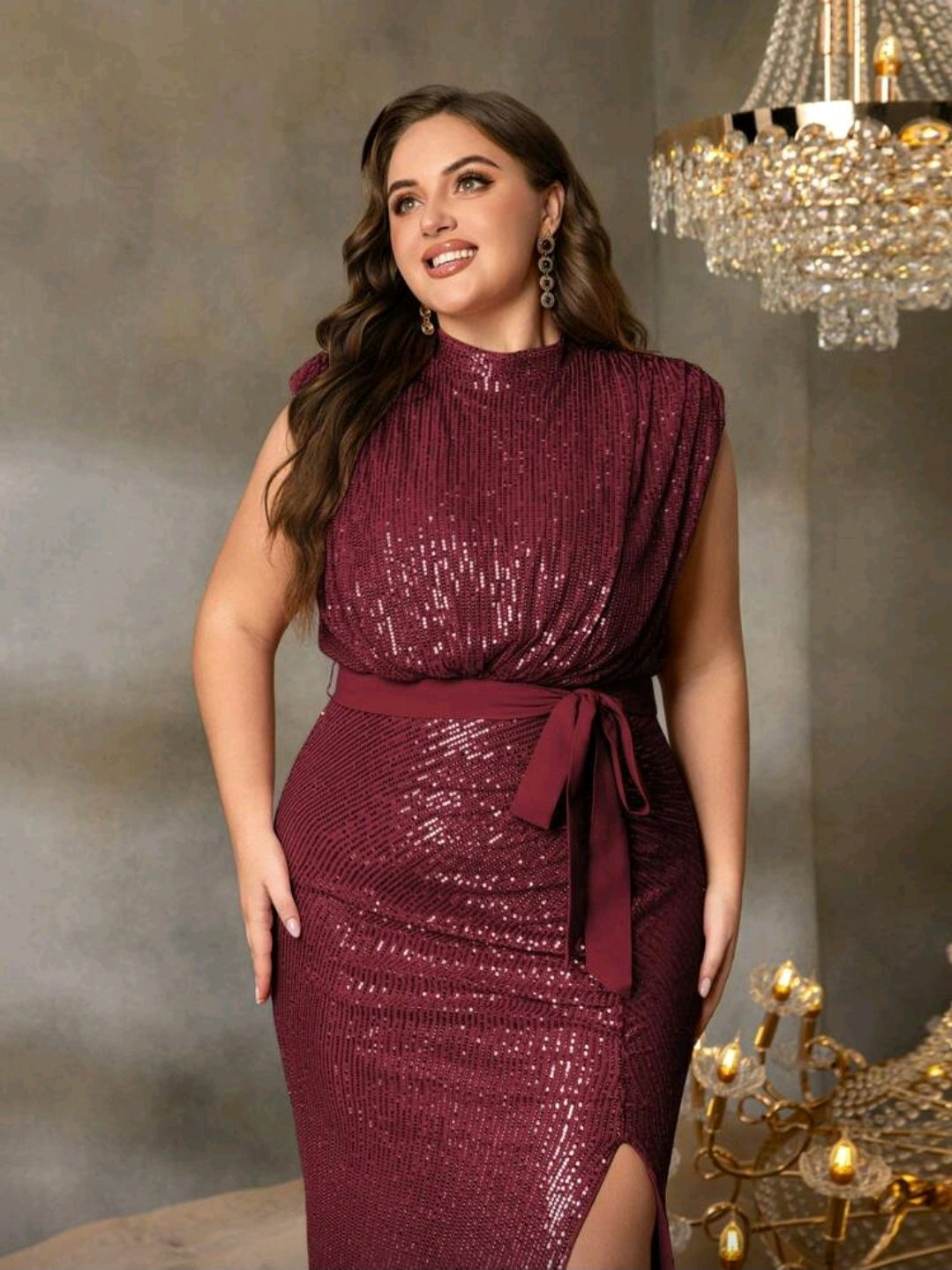 فستان سهرة رسمي أنيق بدون أكمام بفتحة عالية وحزام خصر، فستان نسائي لحفلات الزفاف