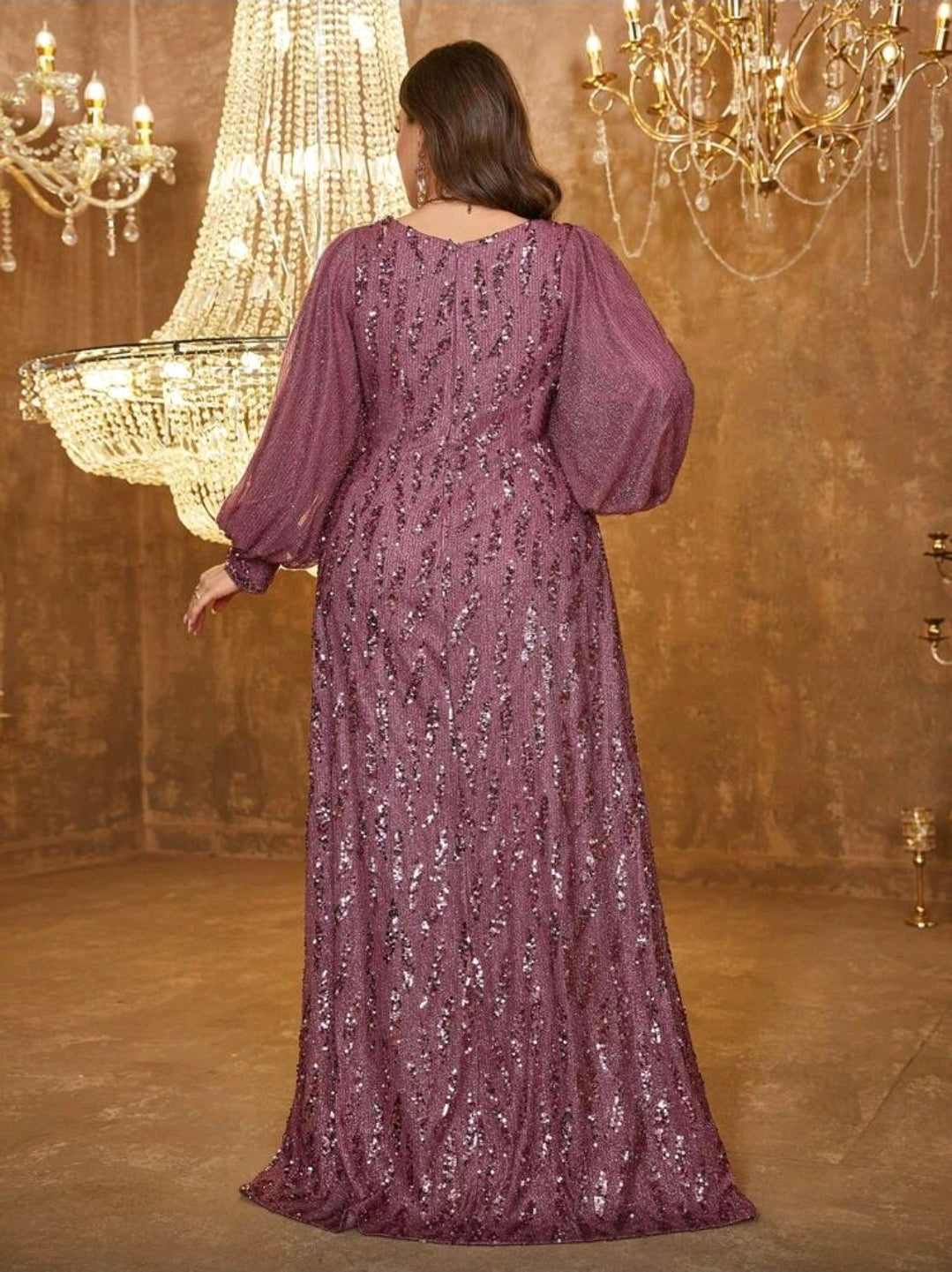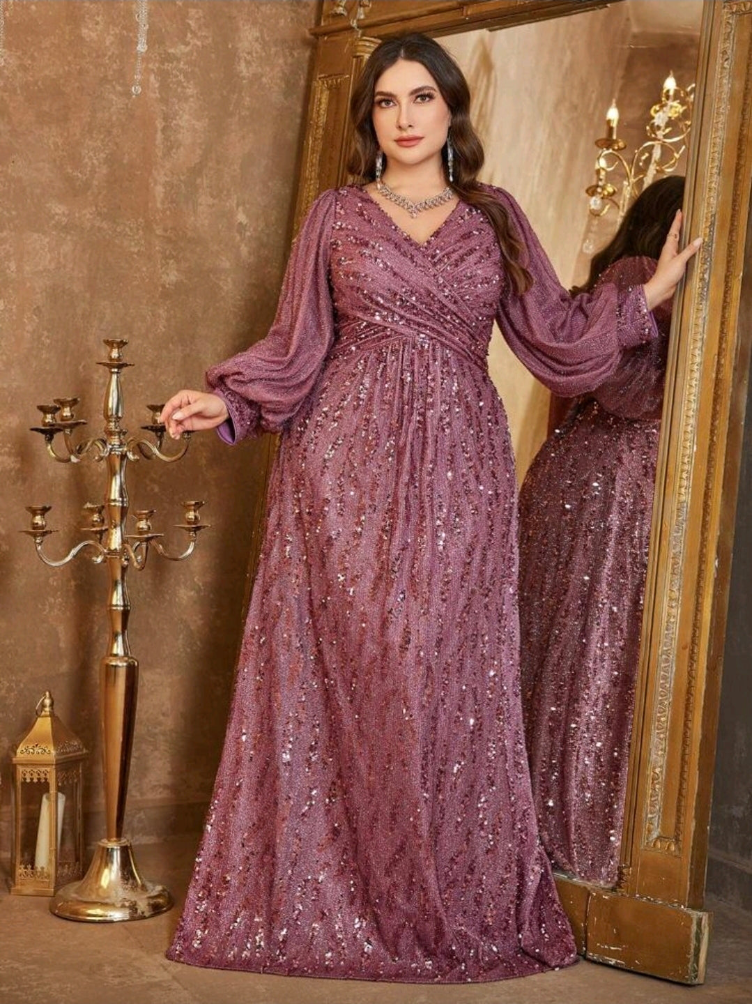 فستان سهرة أنيق ، مقاسات كبيرة، مزين بالترتر، بياقة على شكل حرف V وأكمام واسعة، وخصر مطوي من الأمام، بلون موحد