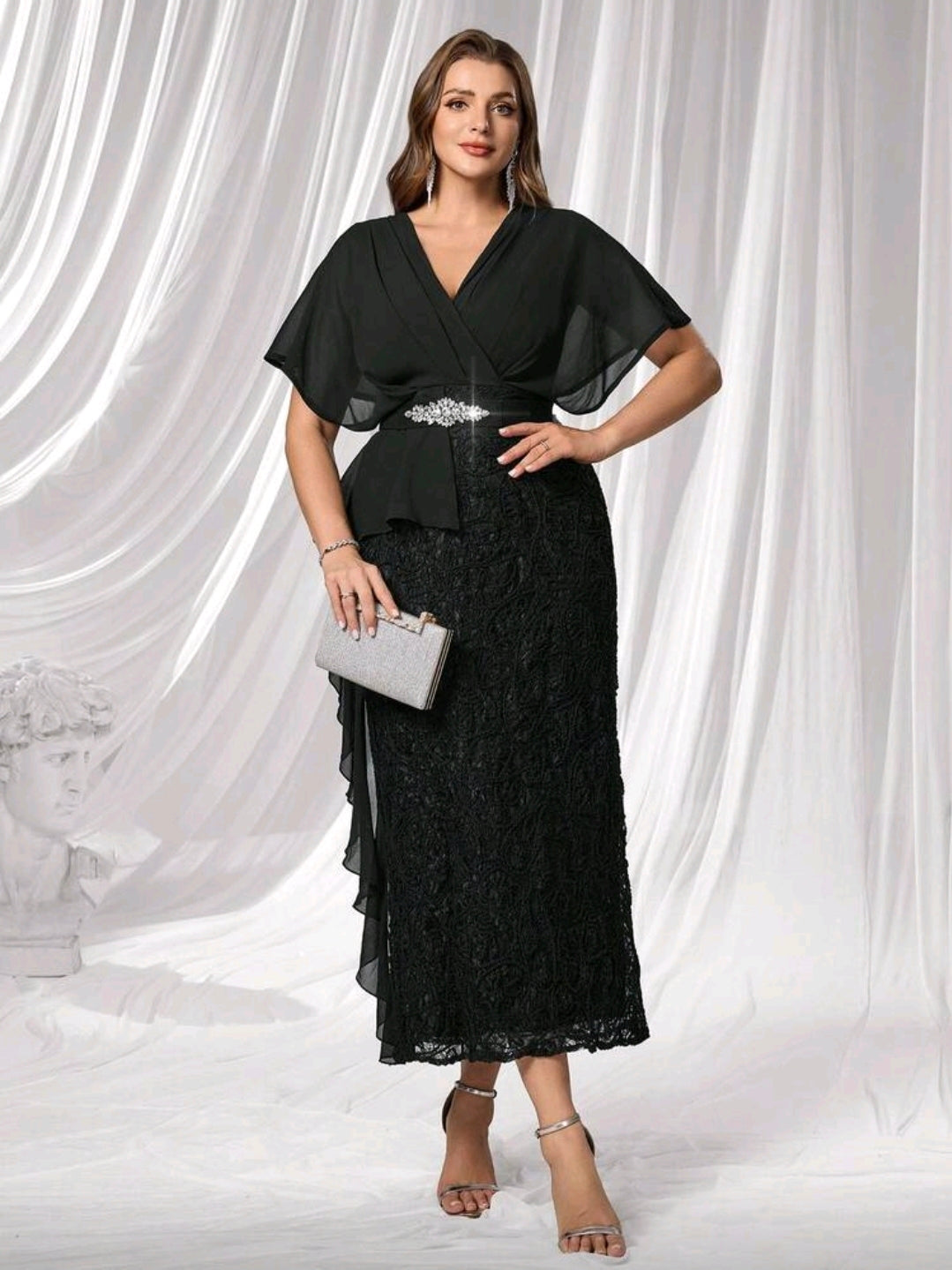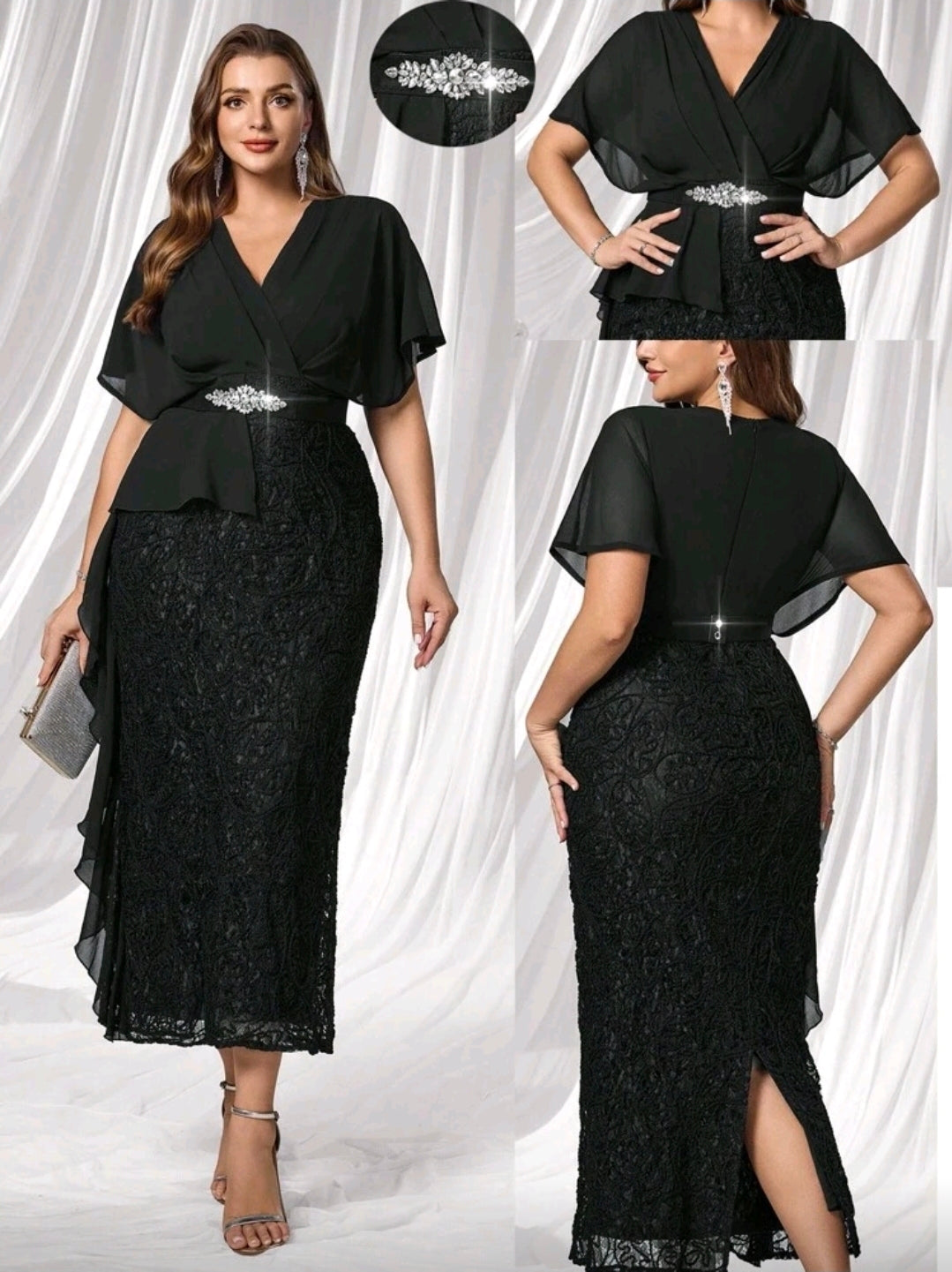 فستان سهرة نسائي أسود بمقاسات كبيرة،أنيق وبسيط مع اكمام قصيرة من قماش شفاف