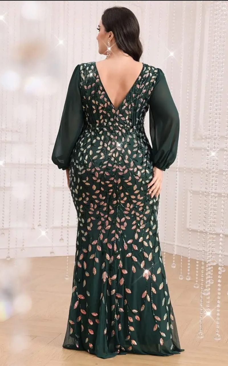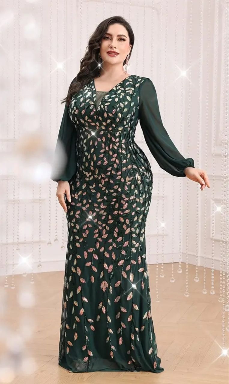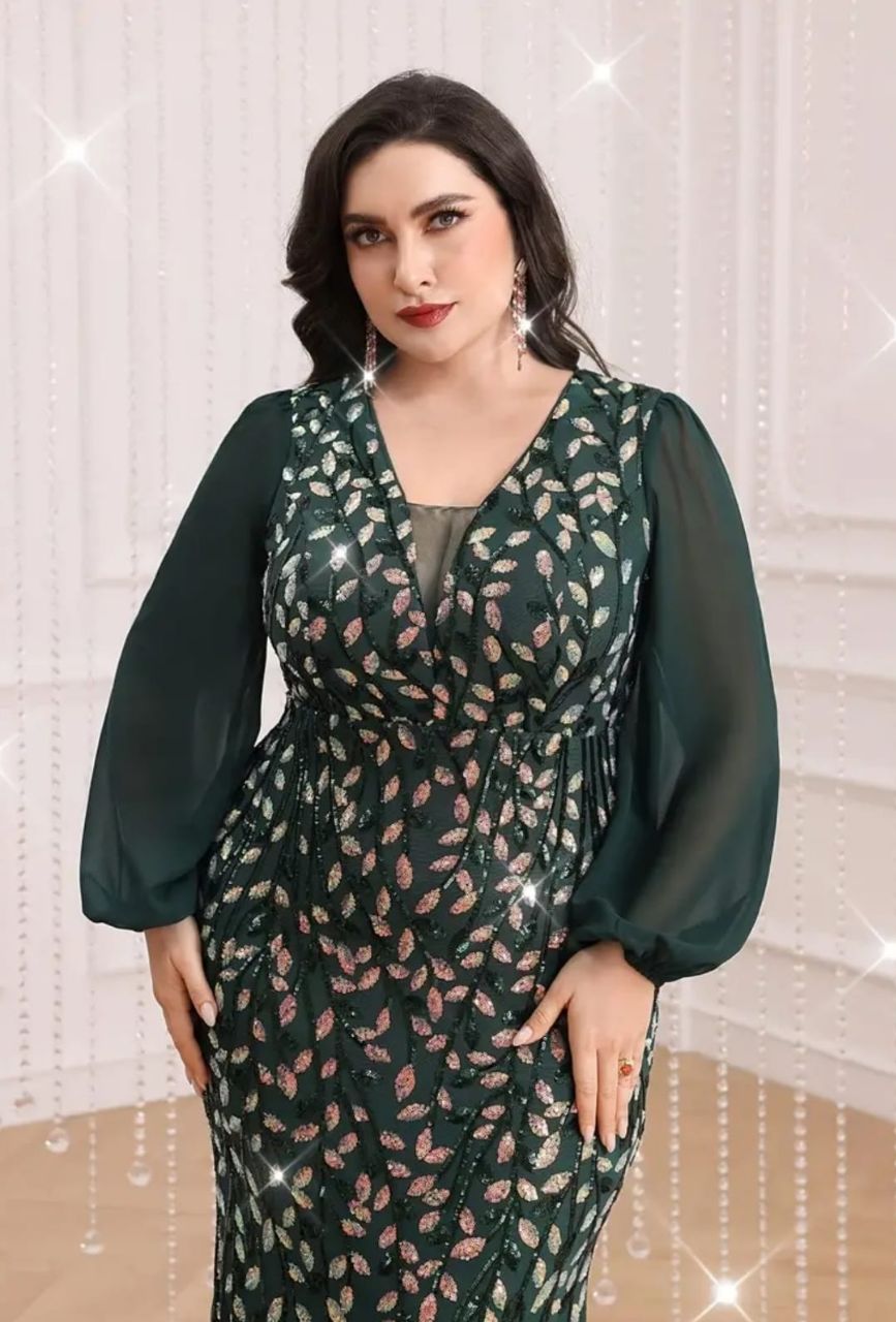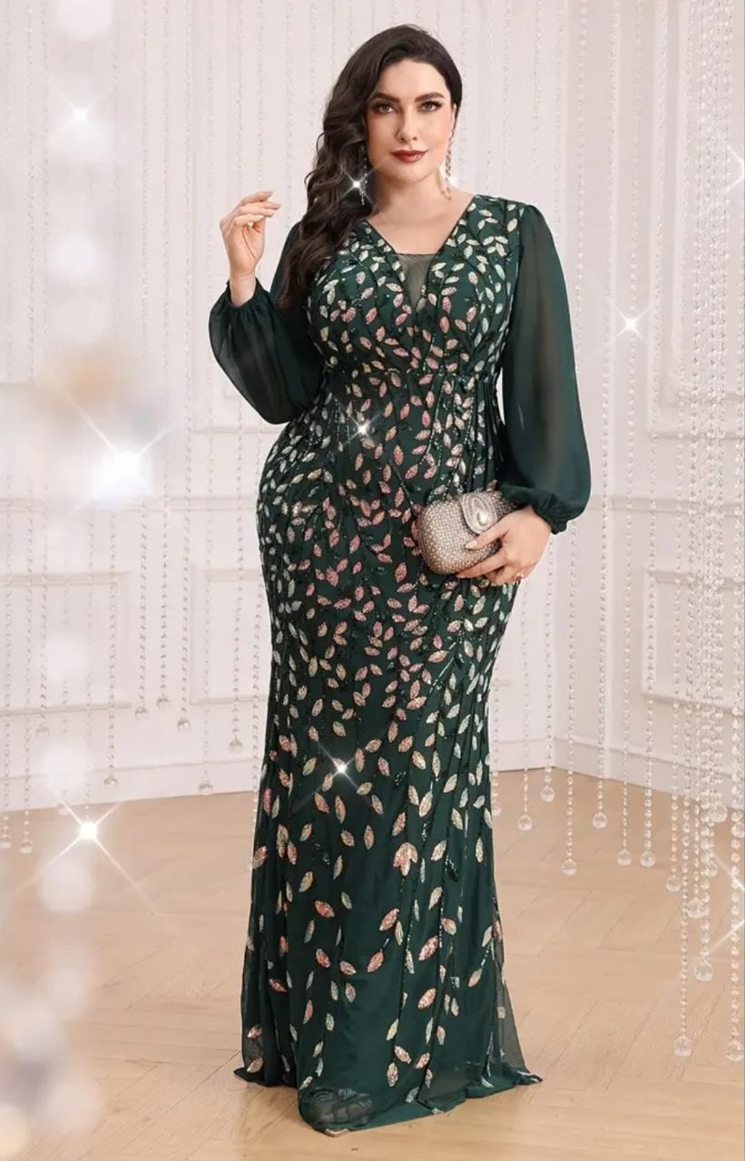 فستان أخضر مزين بالترتر و أكمام طويلة