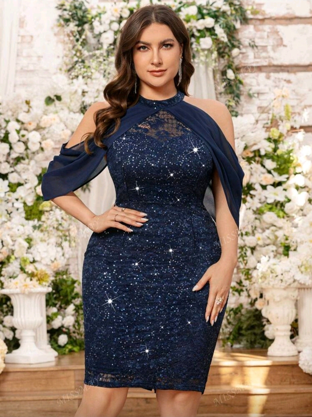 فستان أزرق أنيق بمقاسات كبيرة، من الفولار والدانتيل المتباين، بياقة دائرية، مزين بالترتر، وأكمام قصيرة.