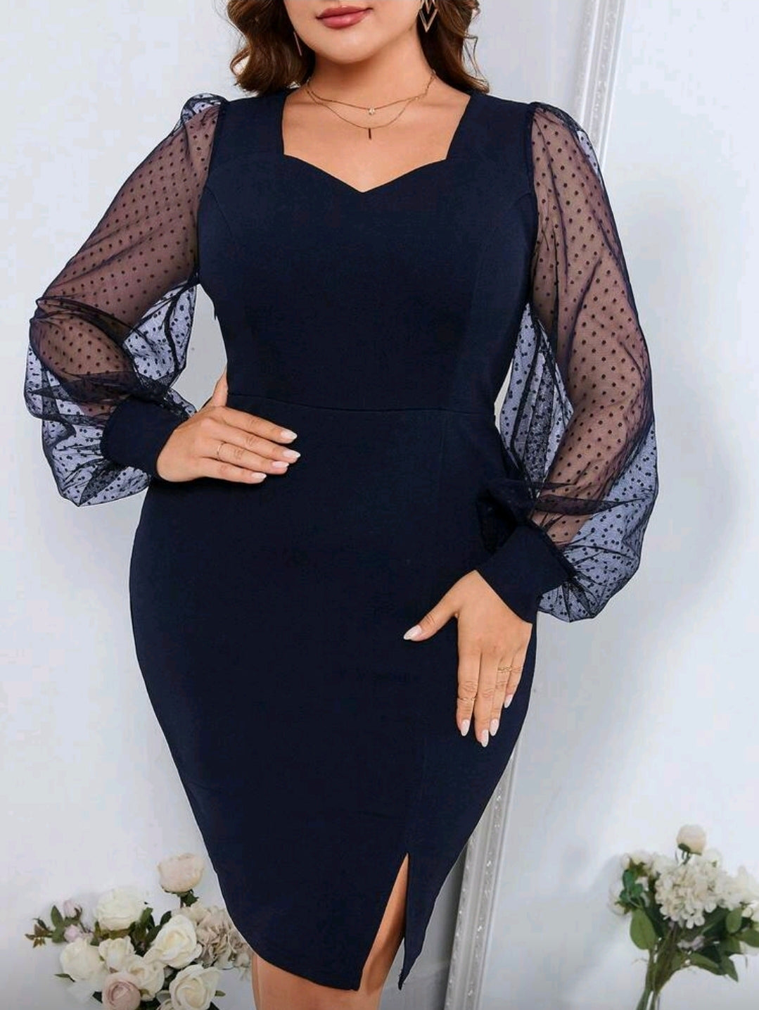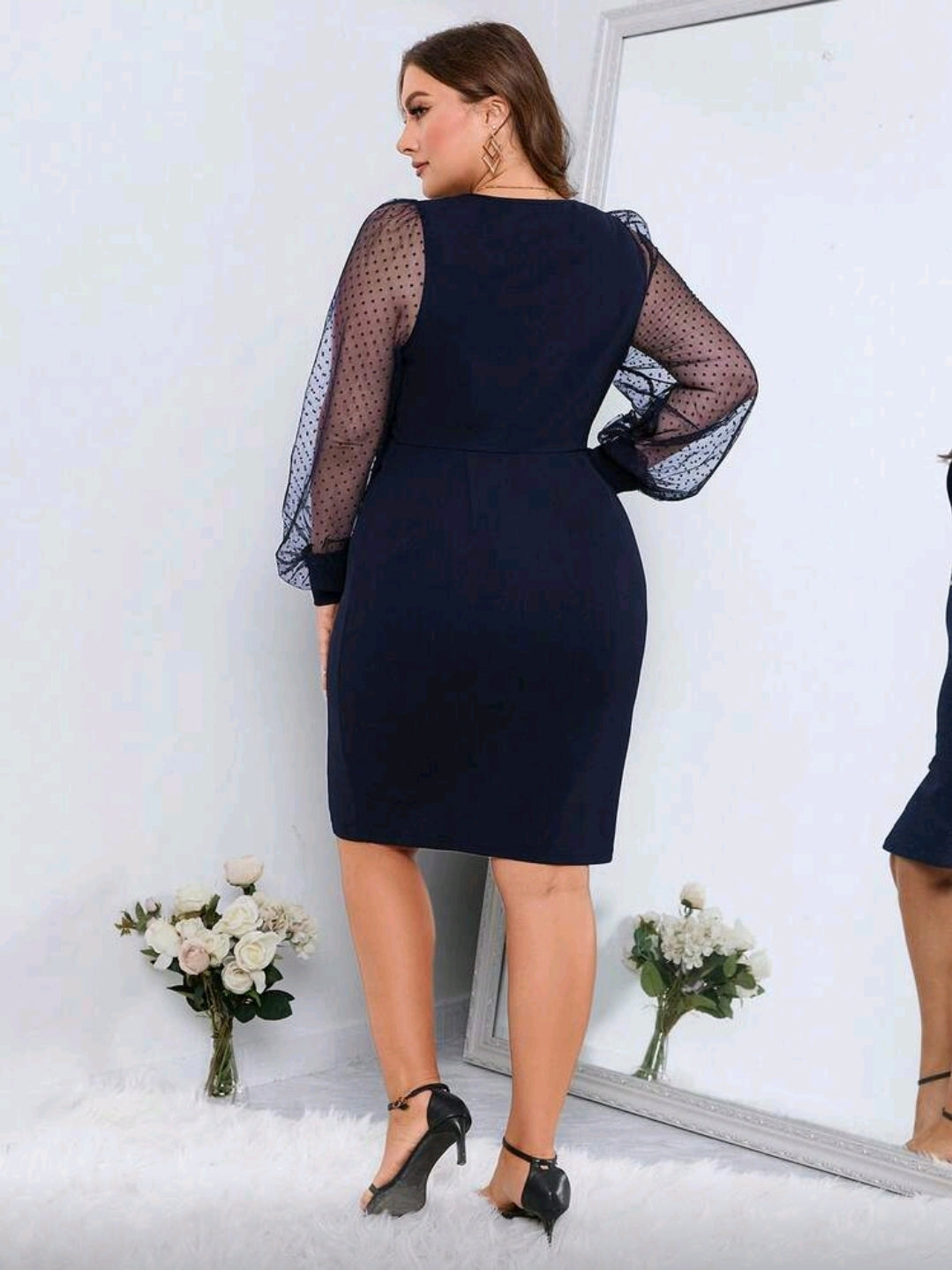 فستانأزرق أنيق ذو المقاسات الكبيرة بأكمام طويلة بشبكة منقطة