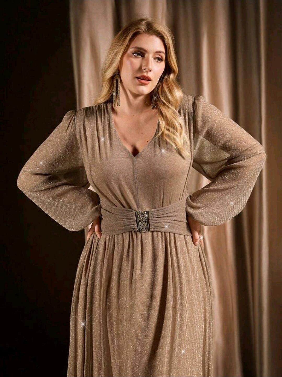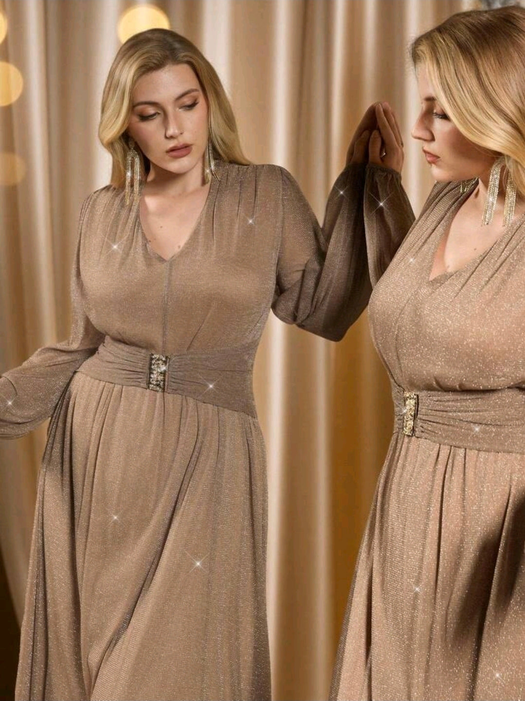 فستان أنيق بياقة على شكل حرف V وأكمام طويلة، مزين بترتر لامع وحافة مكشكشة مزينة بقفل من الاحجار، متوفر بمقاسات كبيرة. فستان فاخر بلون بيج، بأكمام طويلة.