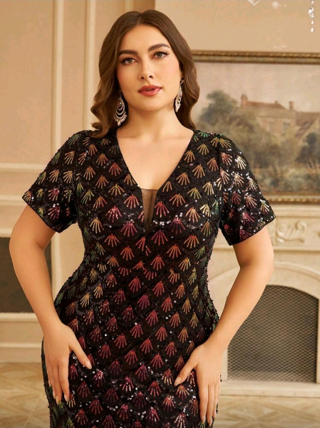 فستان سهرة نسائي برقبة على شكل حرف V وأكمام قصيرة مزين بالترتر وذيل حورية البحر
