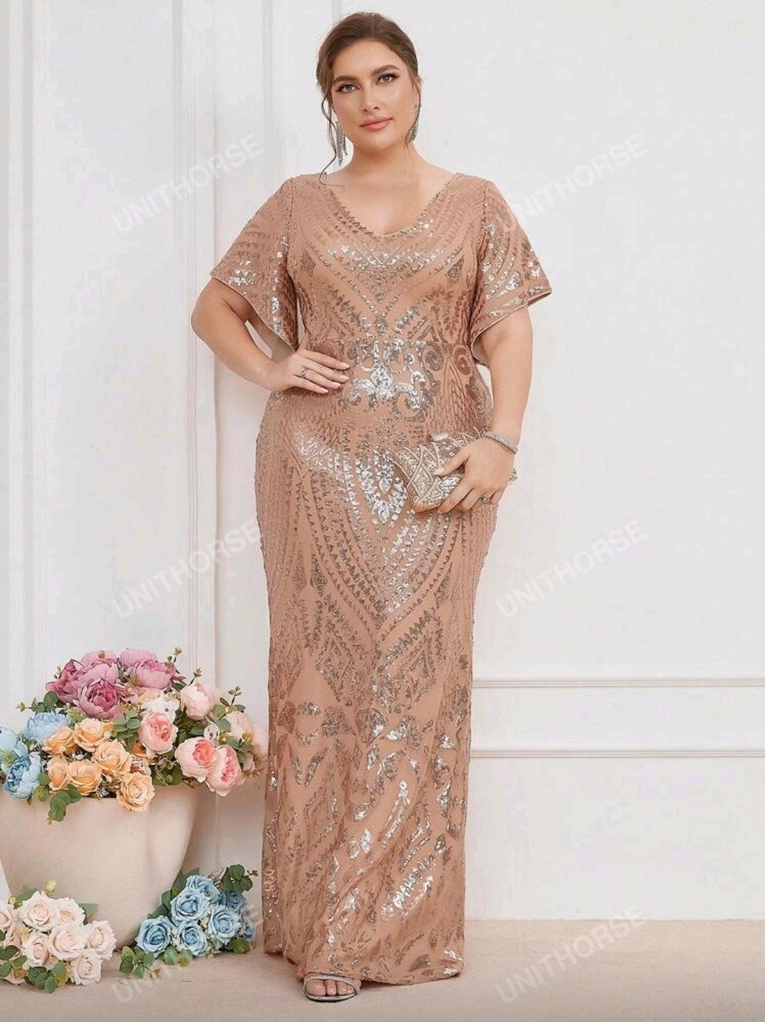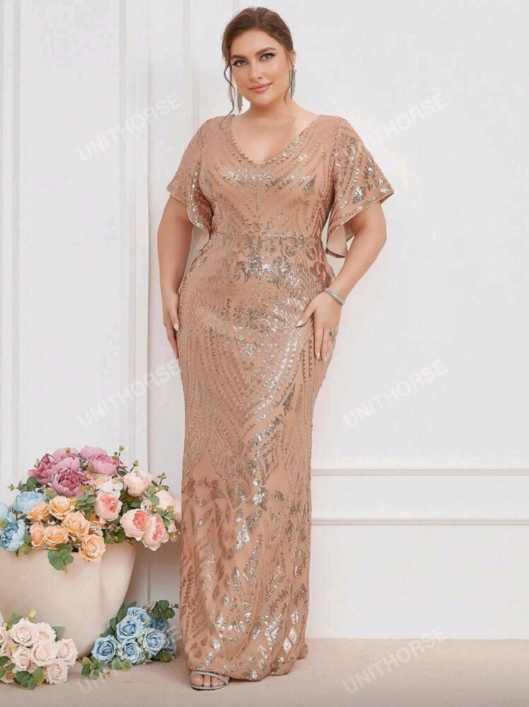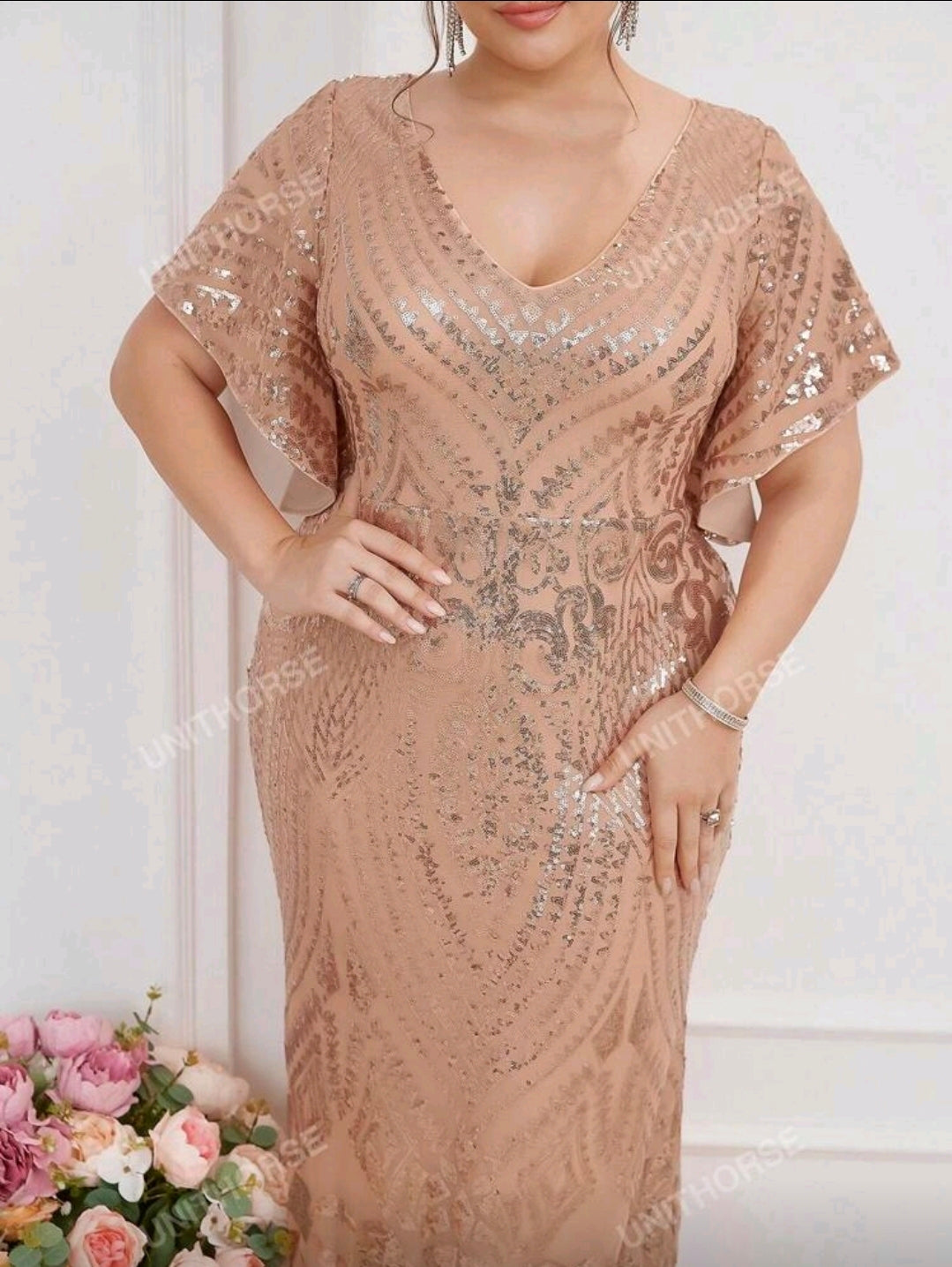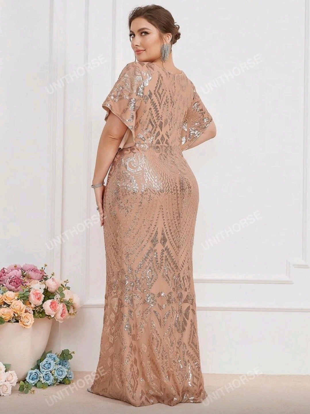 فستان سهرة أنيق بأكمام مكشكشة قصيرة مزين بالترتر