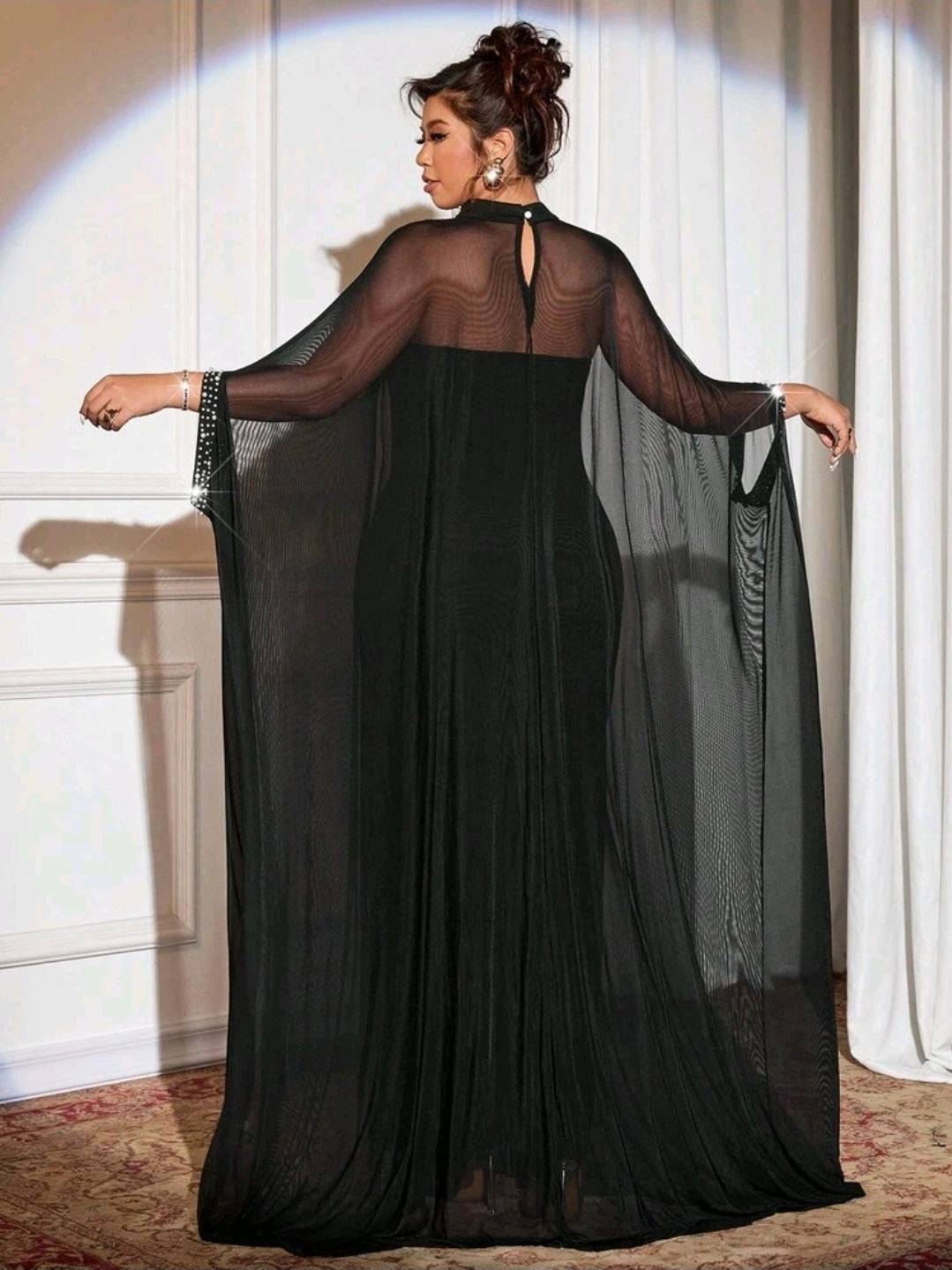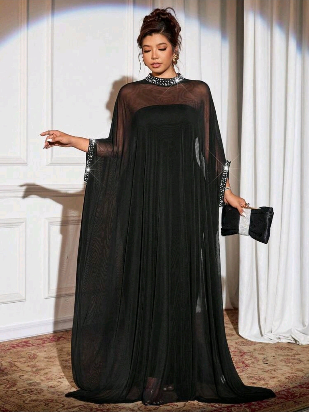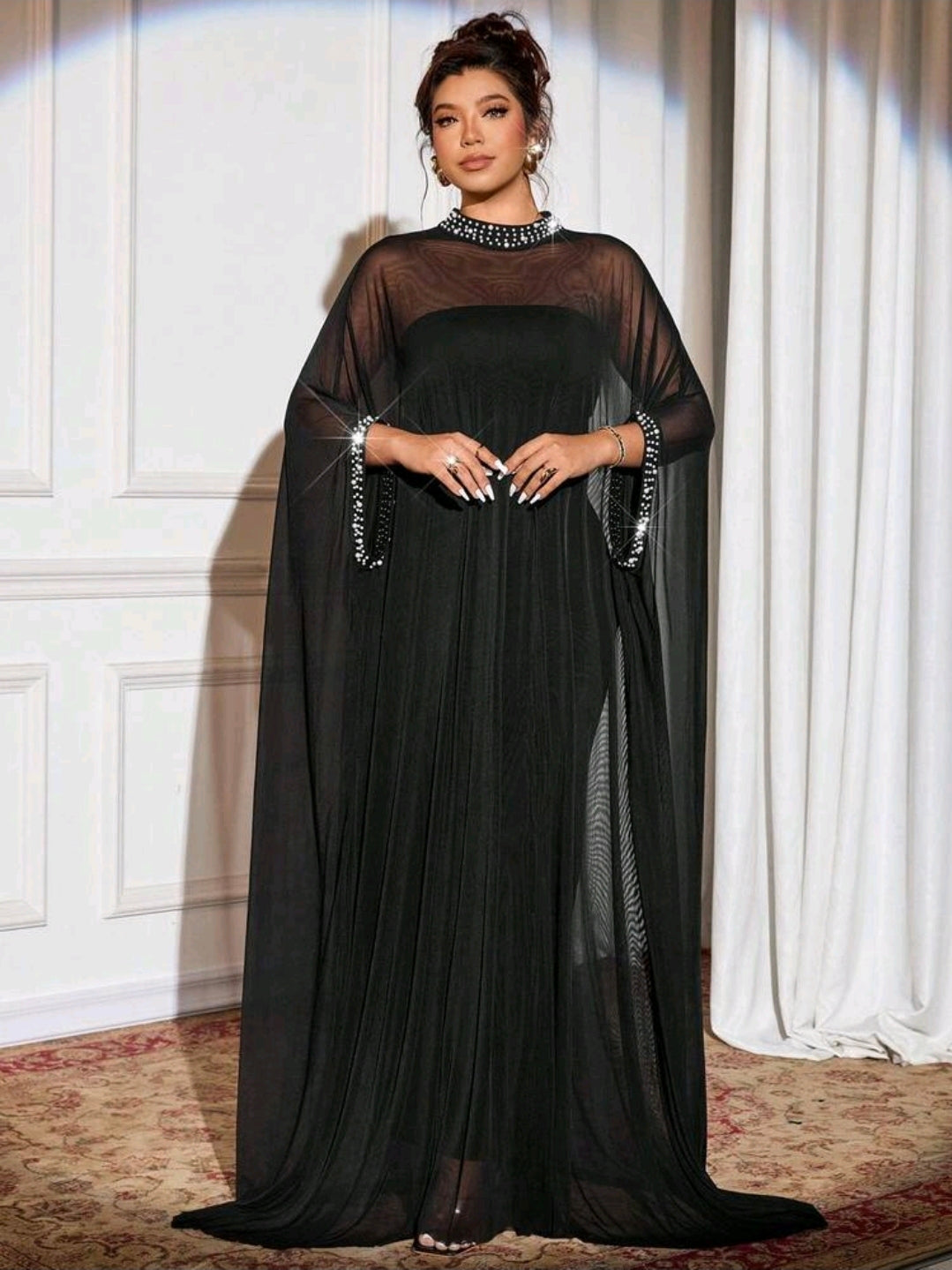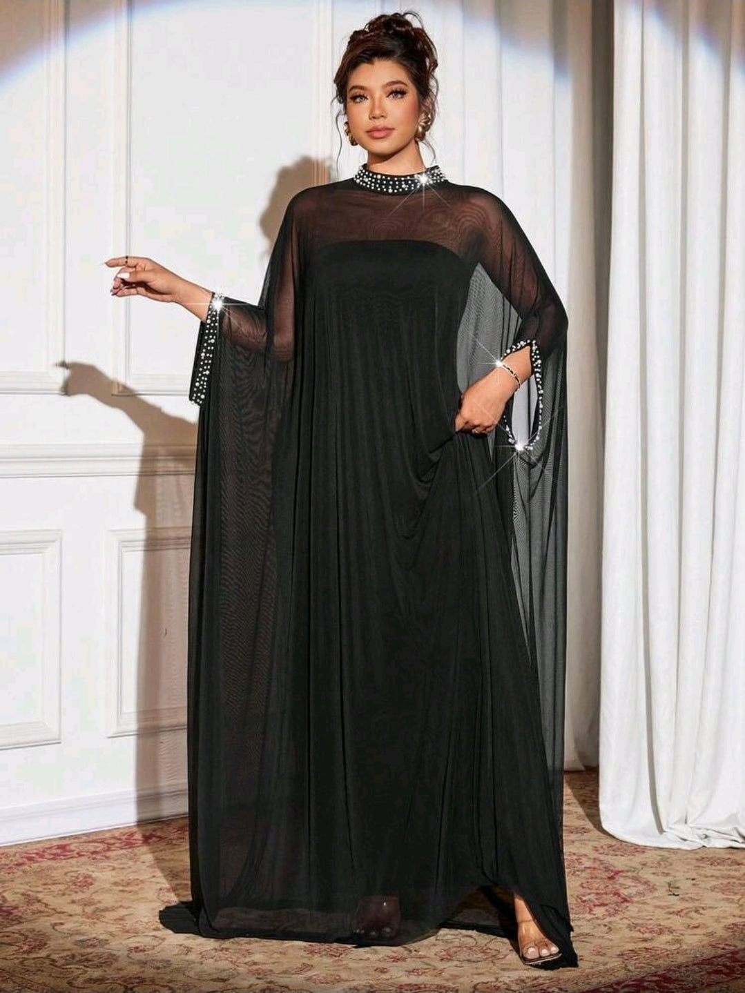 فستان مكون من قطعتين: بلوزة طويلة مزينة باللؤلؤ المنتفخ فالرقبة و اليدين وفستان اسود طويل