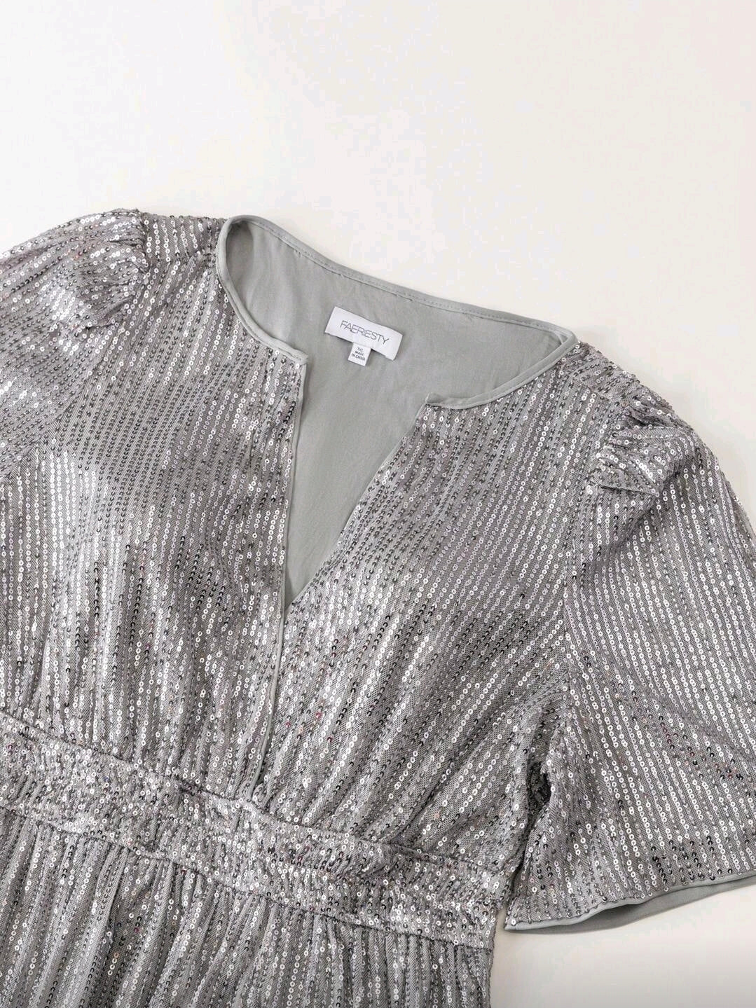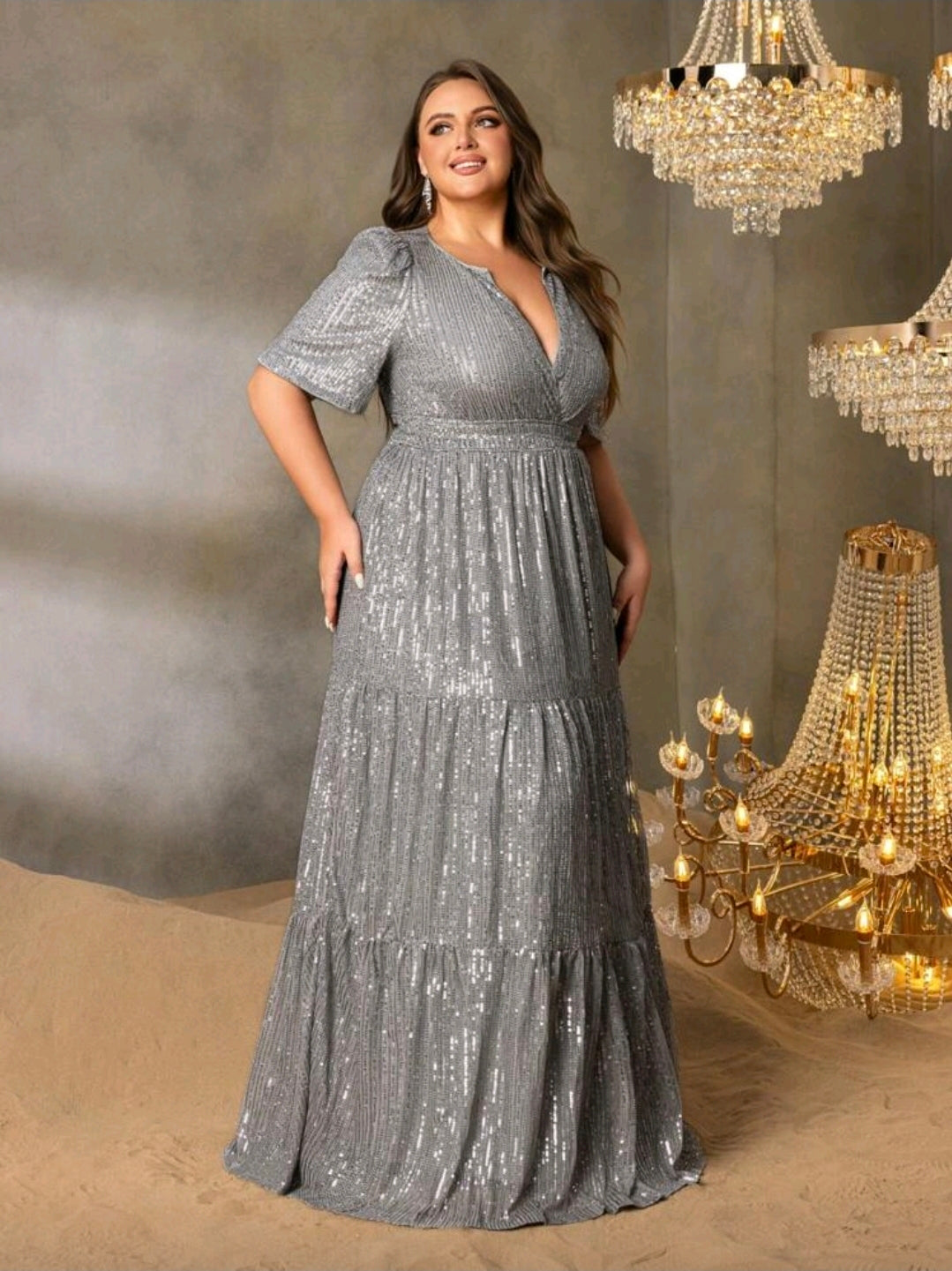 فستان رسمي أنيق بمقاس كبير فتحة رقبة عميقة على شكل حرف V، وأكمام قصيرة أنيقة، وتنورة منحوتة على شكل حرف A