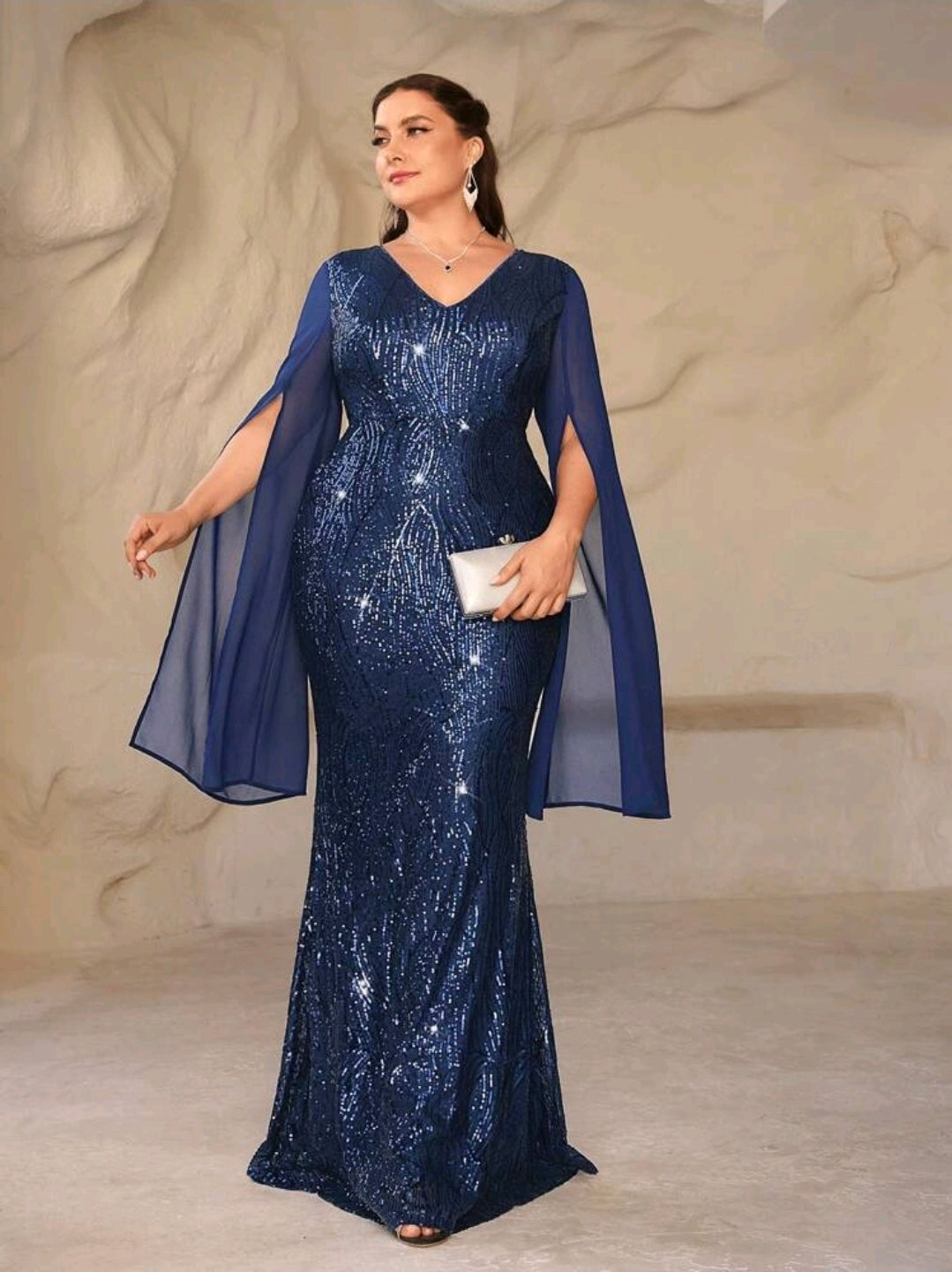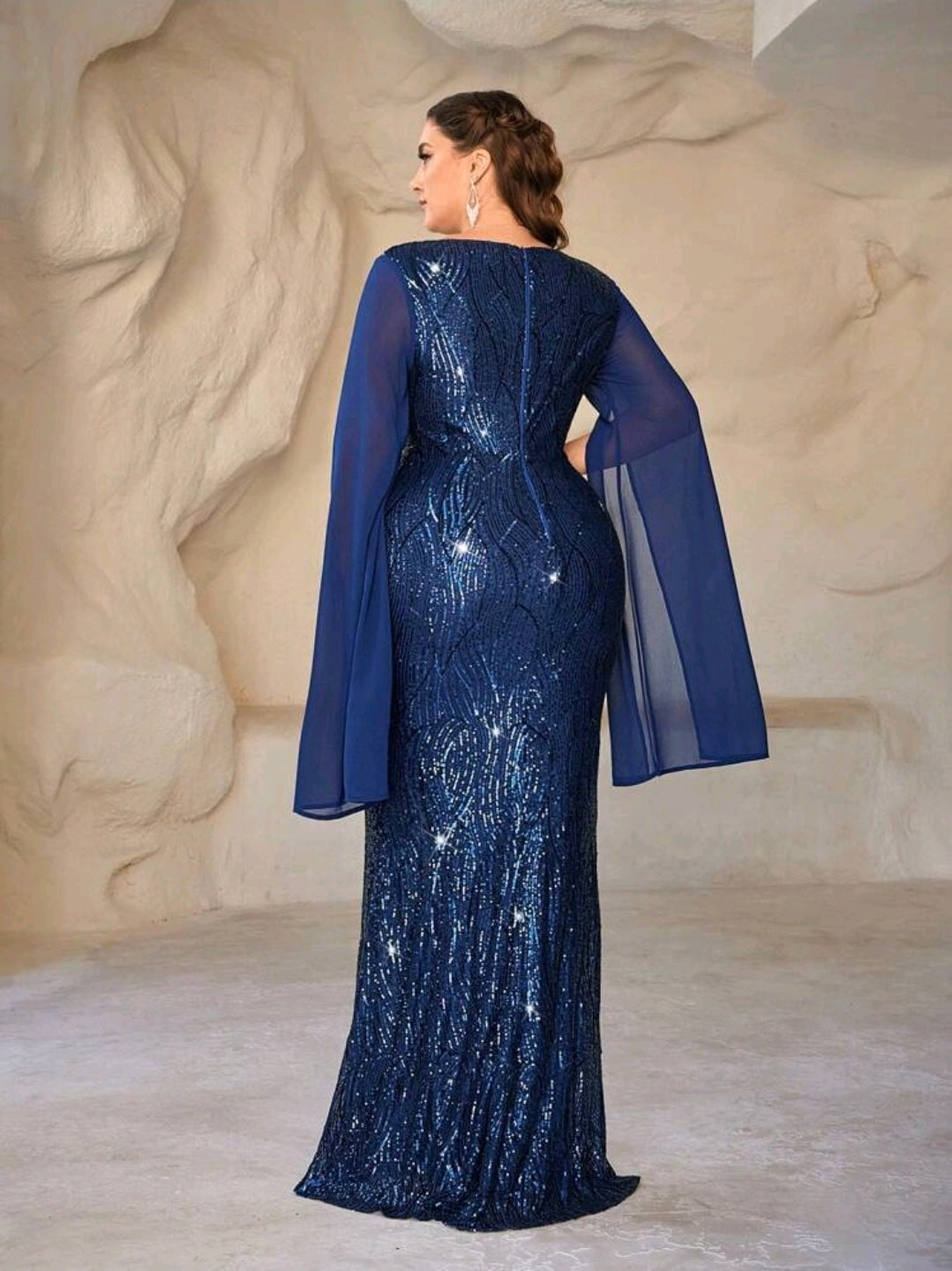 فستان طويل أزرق أنيق مع ترتر متباين باللون الأزرق البحري مع اكمام طويلة مفتوحة