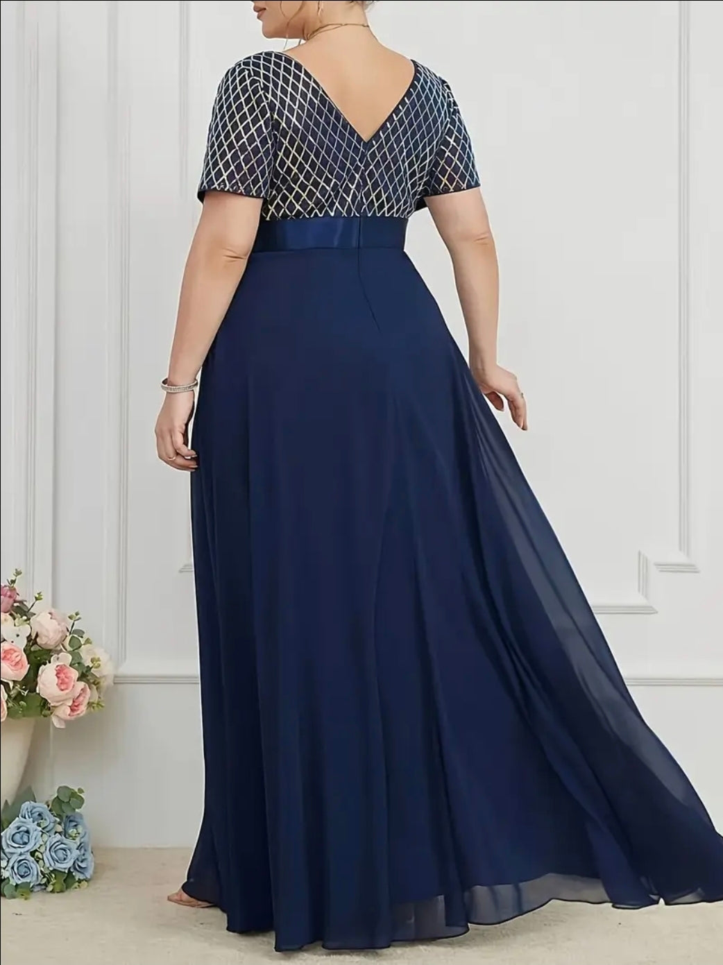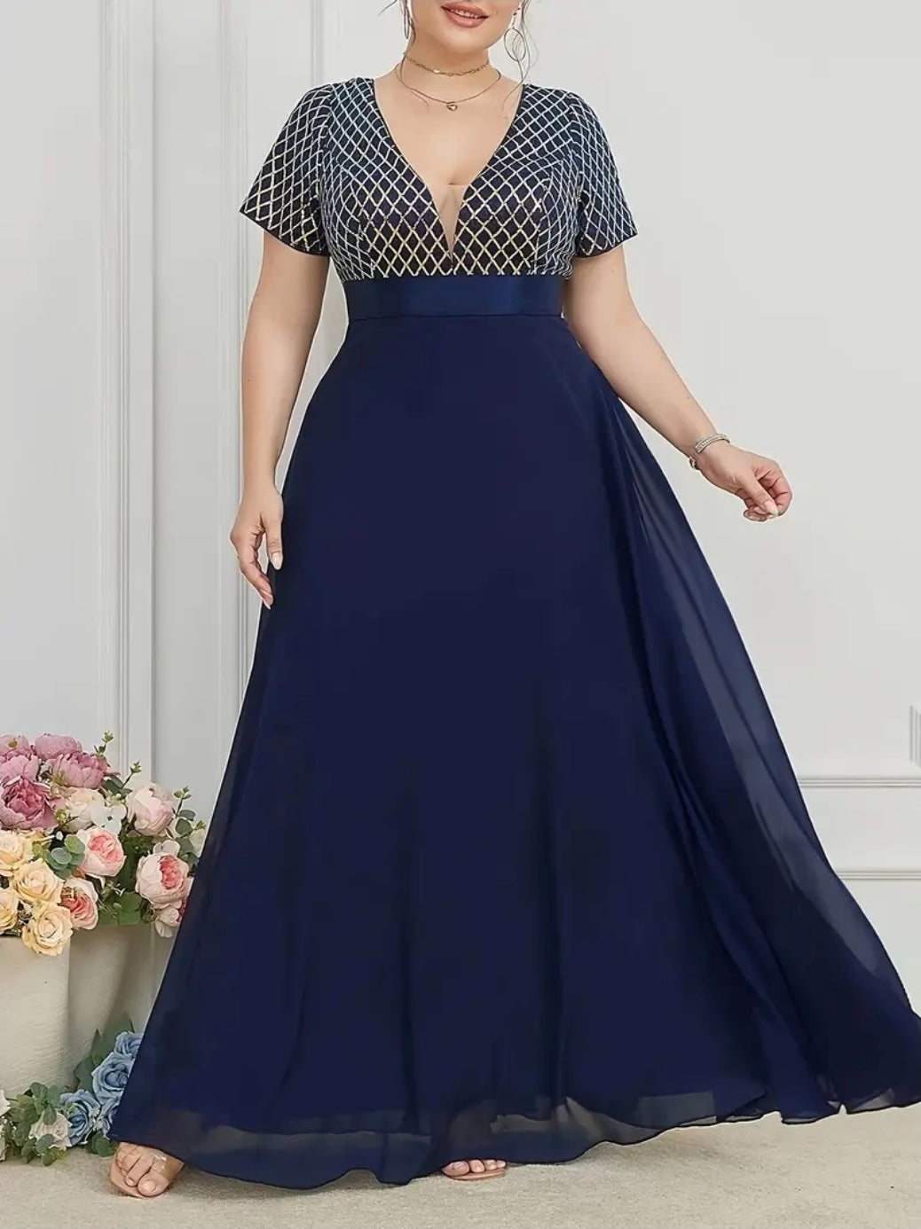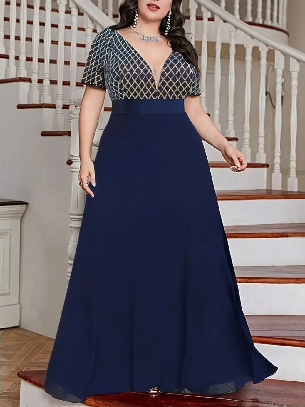 فستان أزرق أنيق بمقاس كبير مع تفاصيل ترتر هندسية - قصة فضفاضة، أكمام قصيرة، رقبة عميقة على شكل حرف V، فستان طويل تفاصيل ترتر هندسية | قماش مطاطي