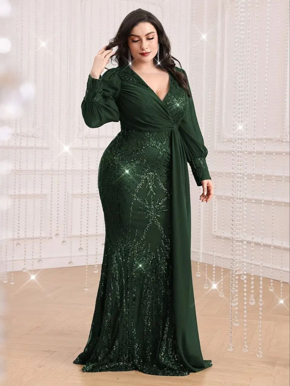 فستان أخضر فاخر و أنيق بأكمام طويلة مزين كامل بالترتر
