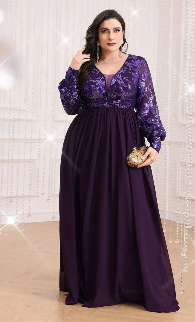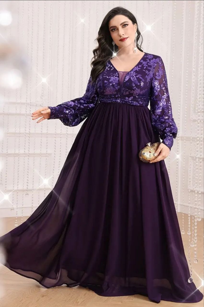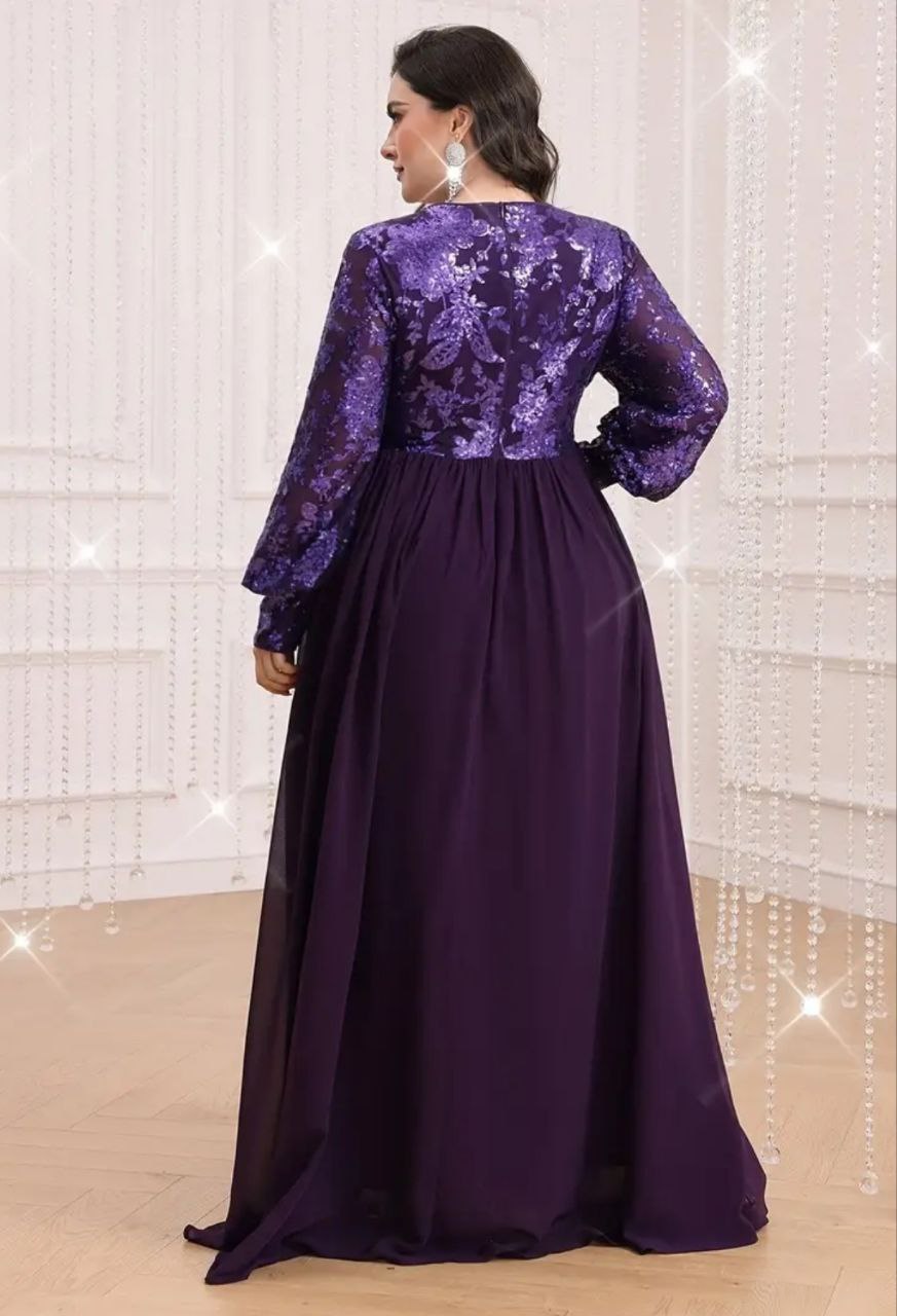 فستان سهرة بمقاس كبير بأكمام فانوس وأشكال مرصعة بالترتر
