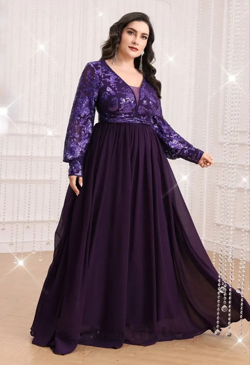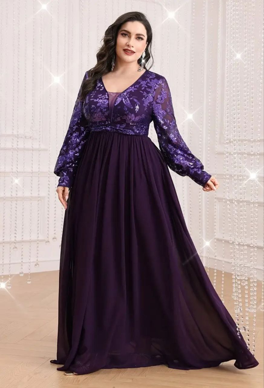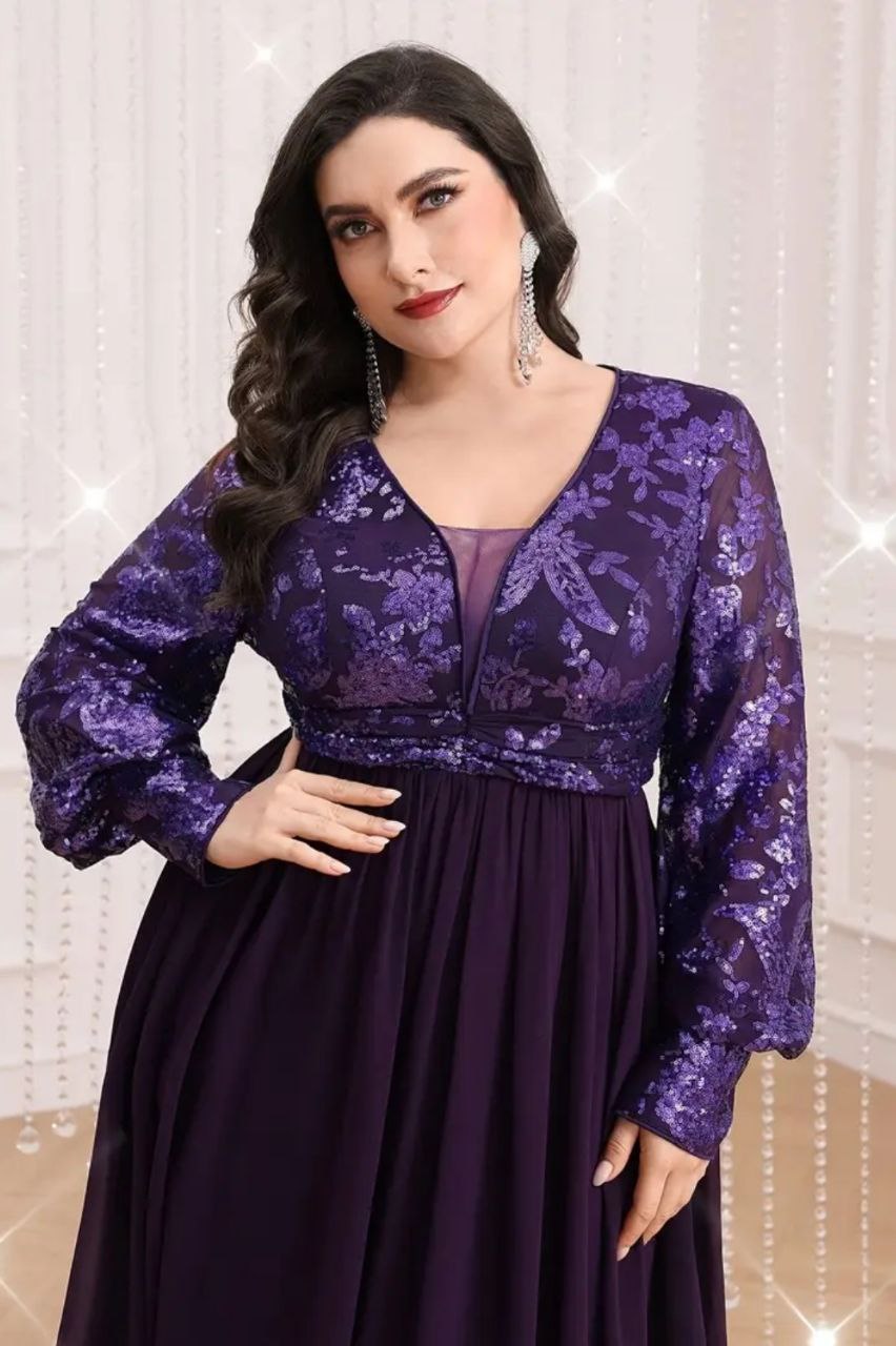 فستان سهرة بمقاس كبير بأكمام فانوس وأشكال مرصعة بالترتر
