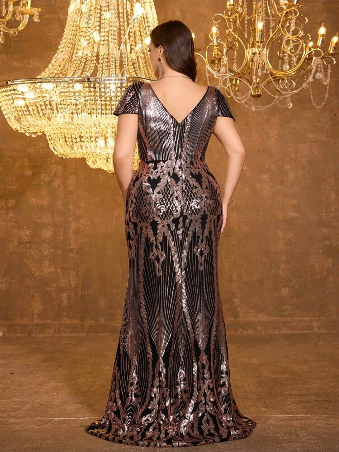 فستان نسائي ذو المقاس الكبير، برقبة على شكل حرف V عميقة، مكشوف الظهر، مزين بالترتر، بأكمام قصيرة