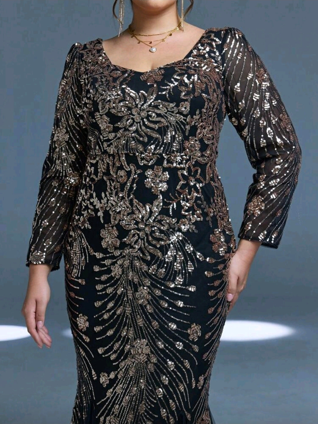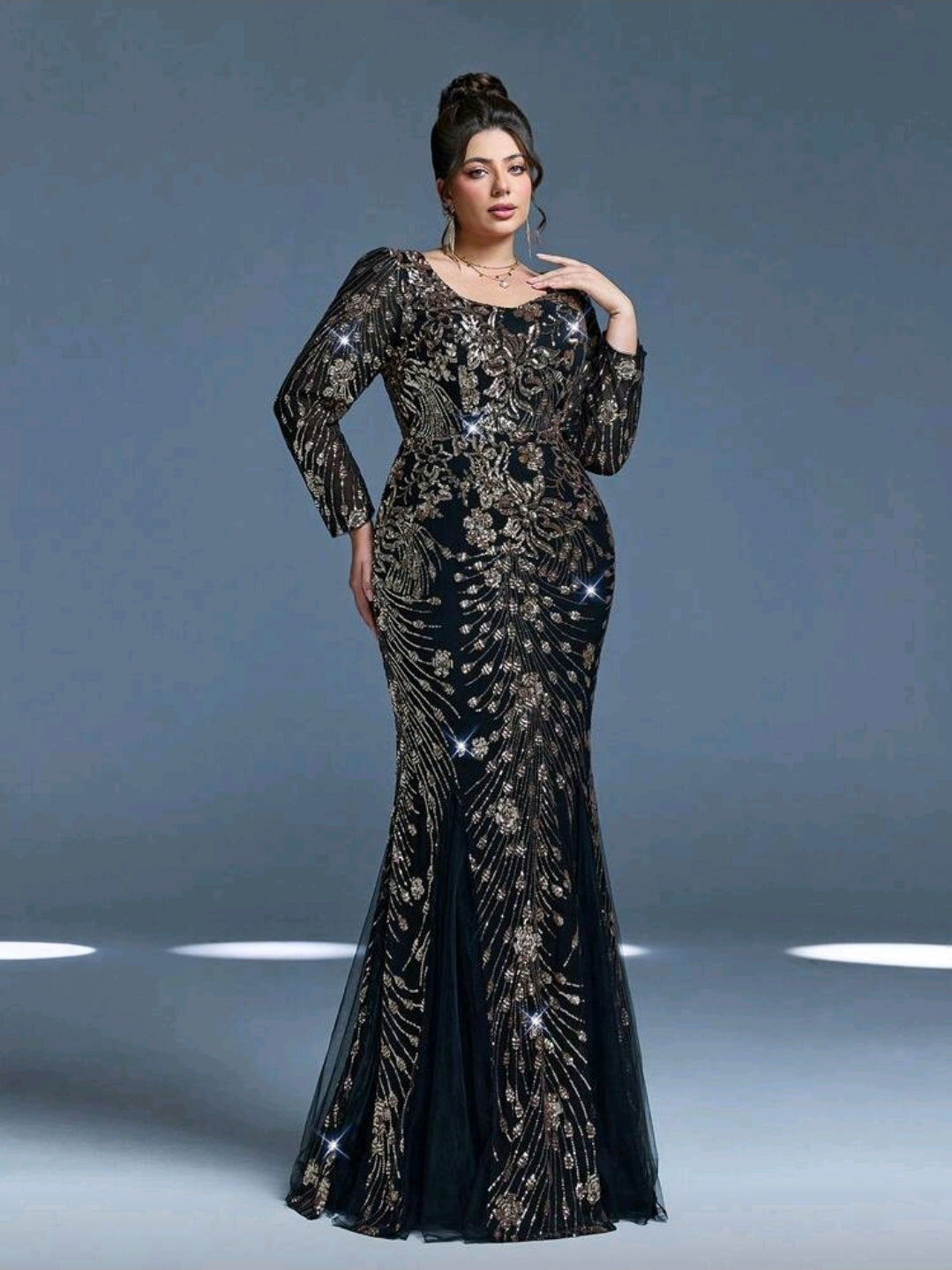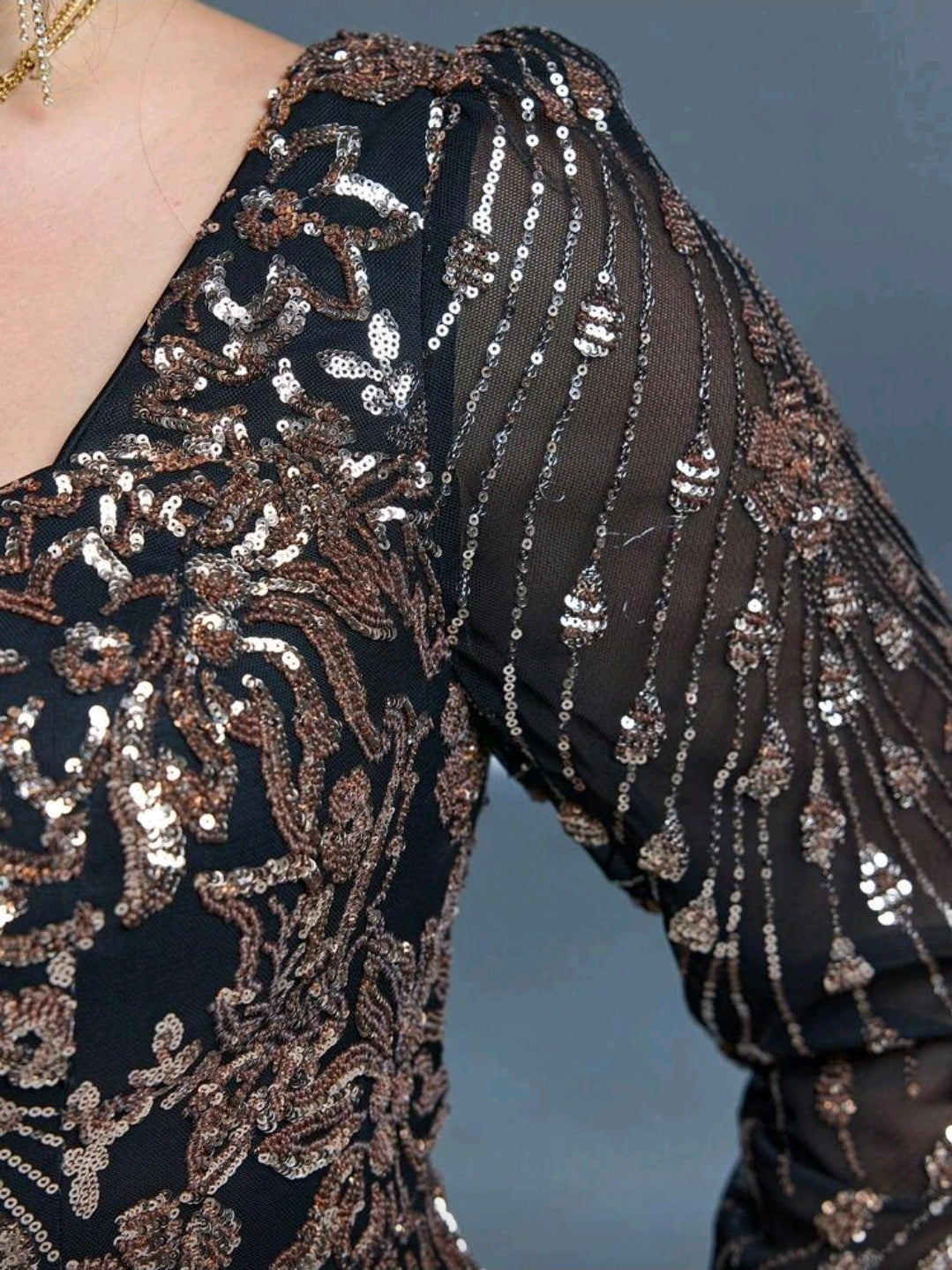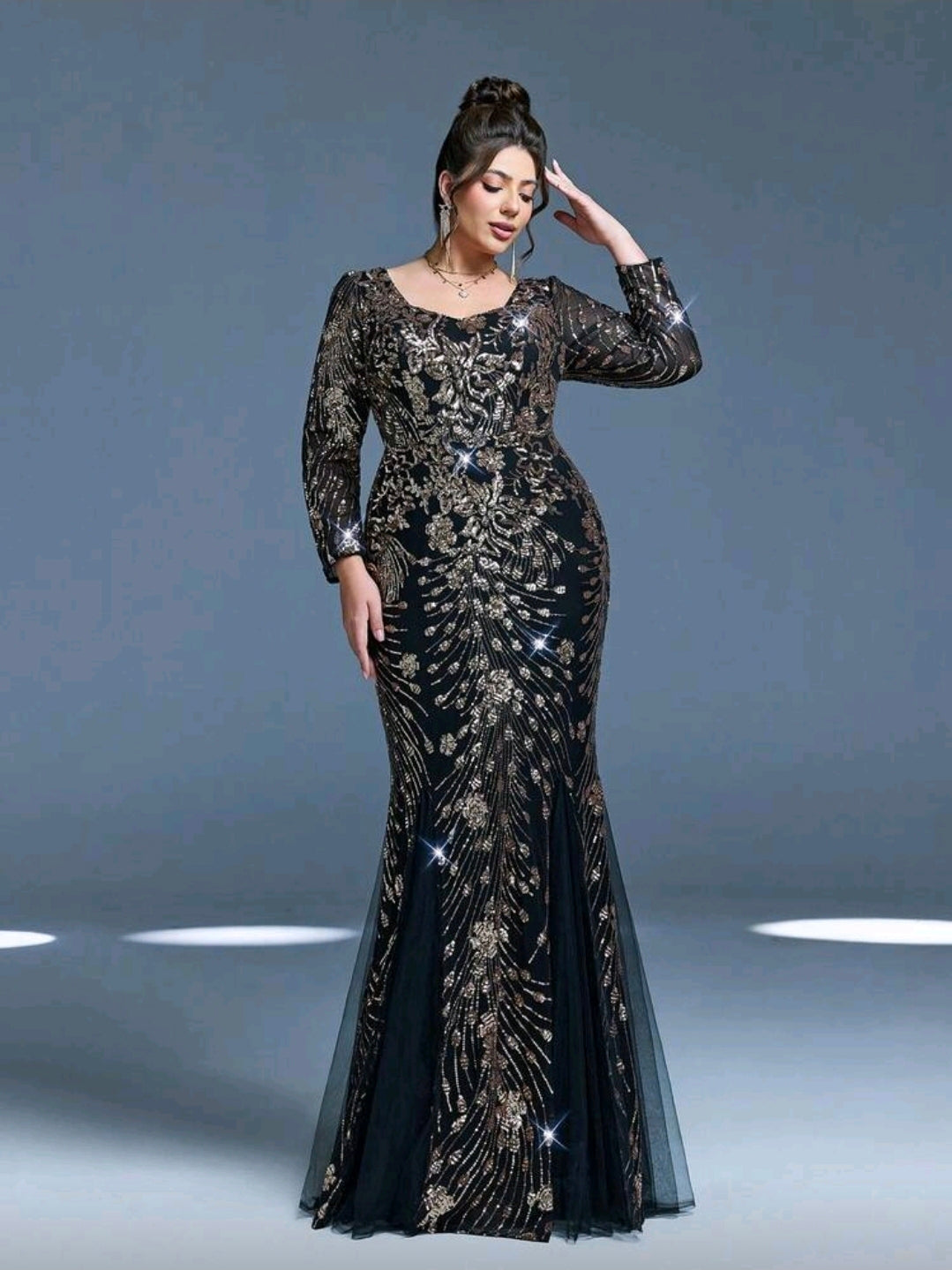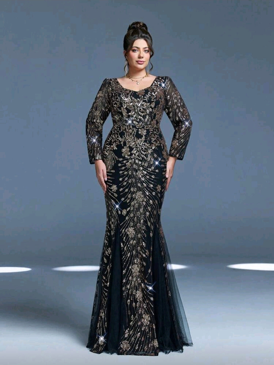 فستان طويل رقبة على شكل حرف V،مزين بالترتر، راقي، فستان سهرة بمقاس كبير، أكمام طويلة، ضيق بحافة حورية البحر