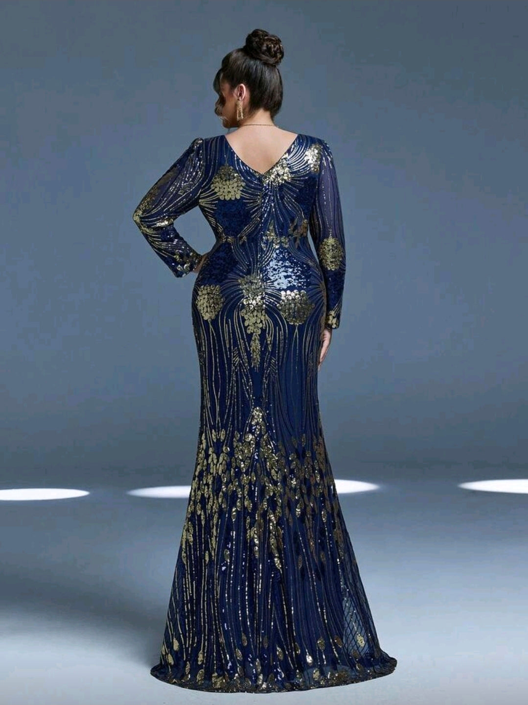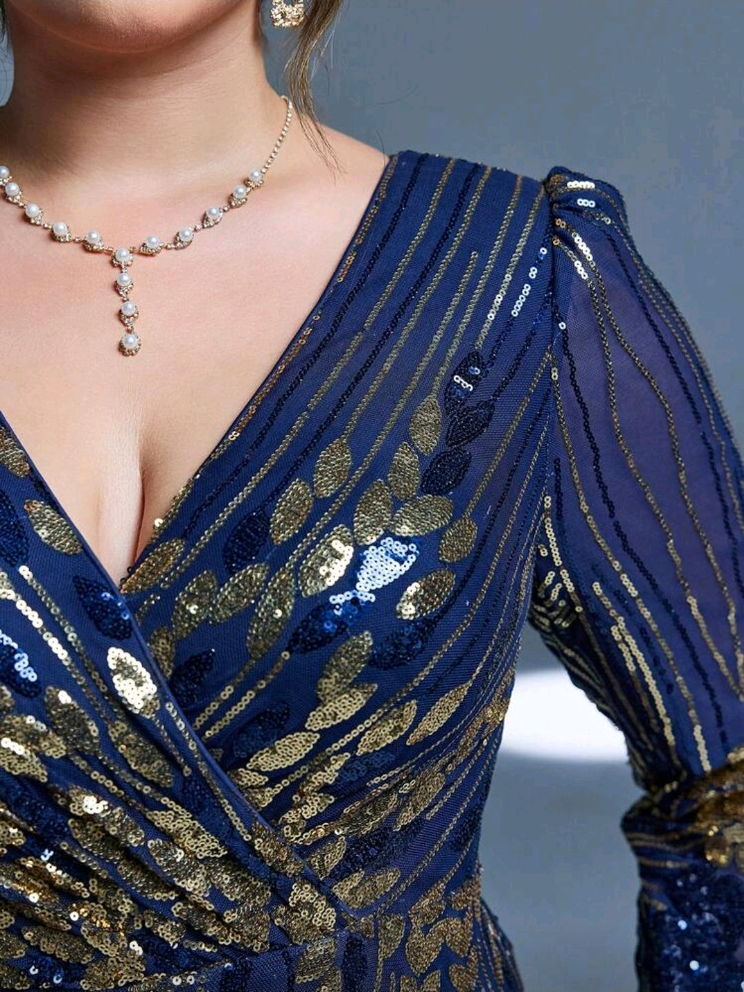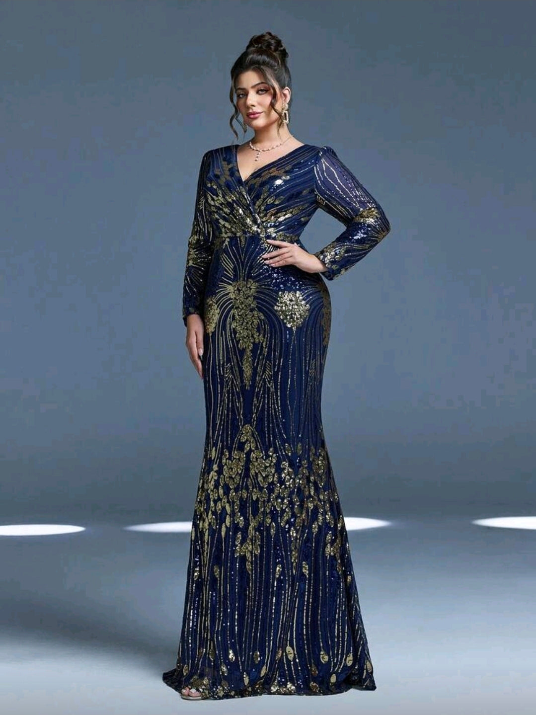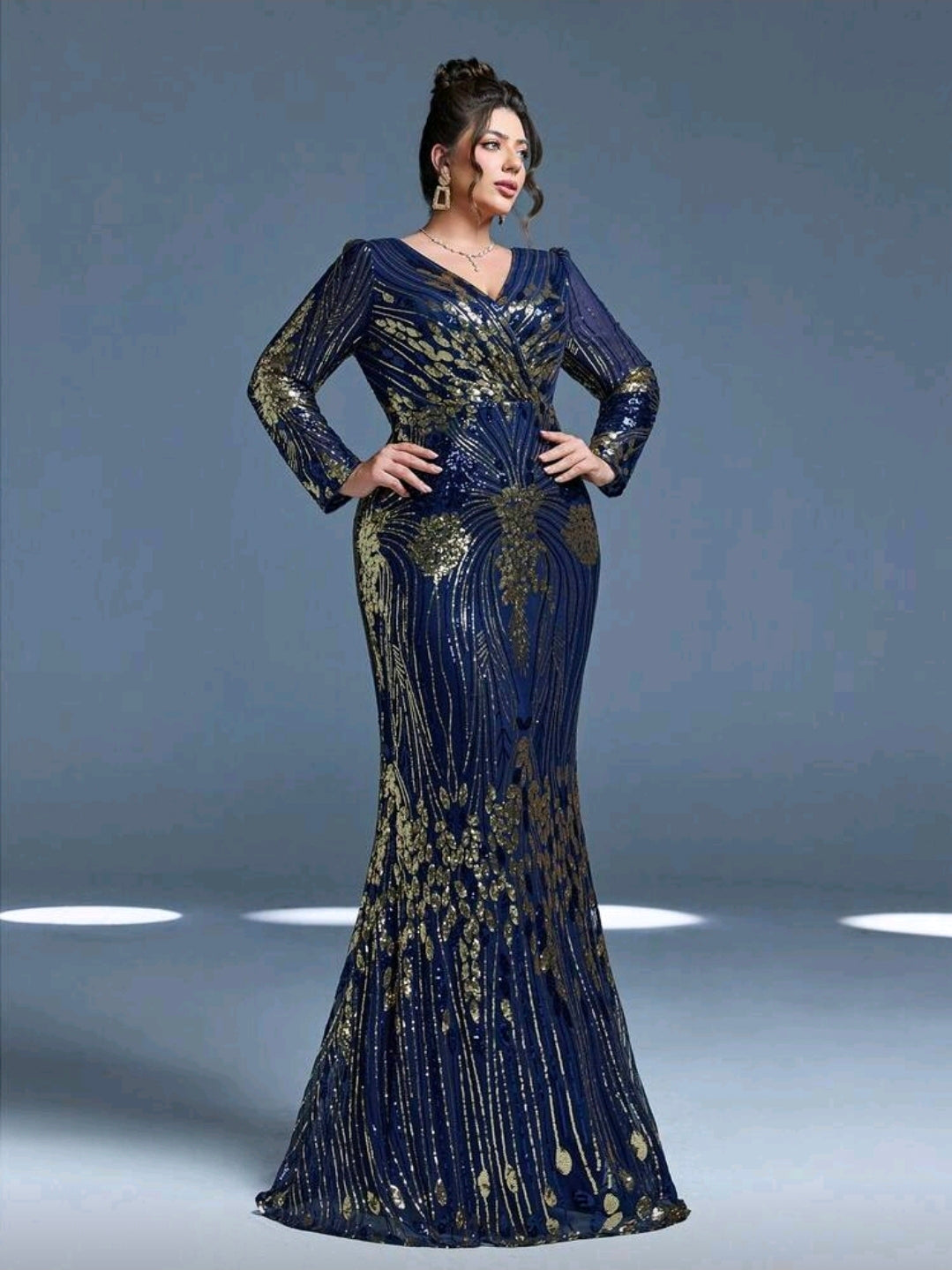فستان برقبة متقاطعة، ترتر لامع، فستان سهرة بمقاس كبير، أكمام طويلة، ضيق، فستان بحافة حورية البحر